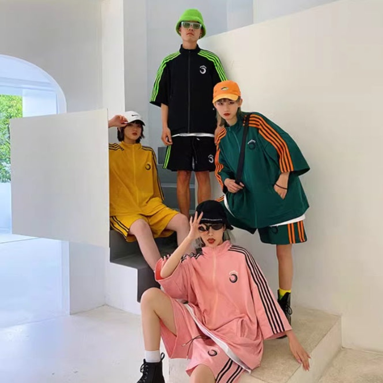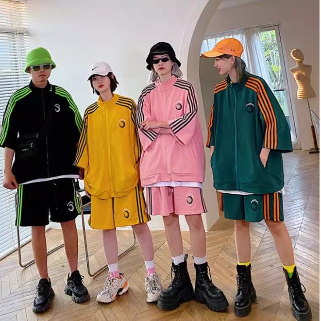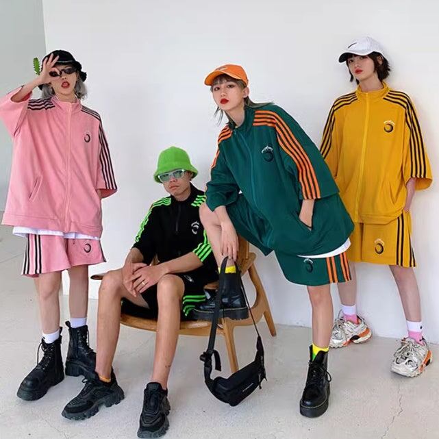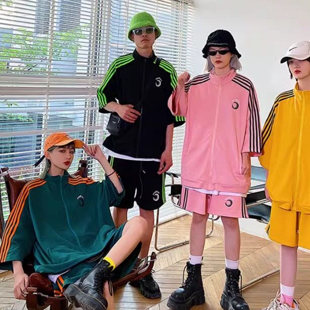 ジャージセットアップ ハーフジャケット レディース 韓国 ファッション ハーフパンツ サイドライン ワンポイント カラフルジャージ オーバーサイズ