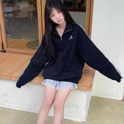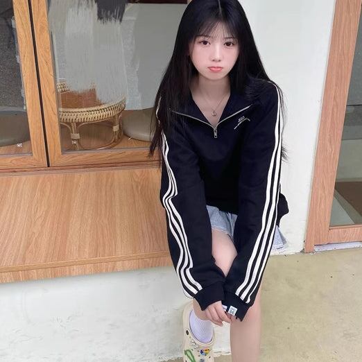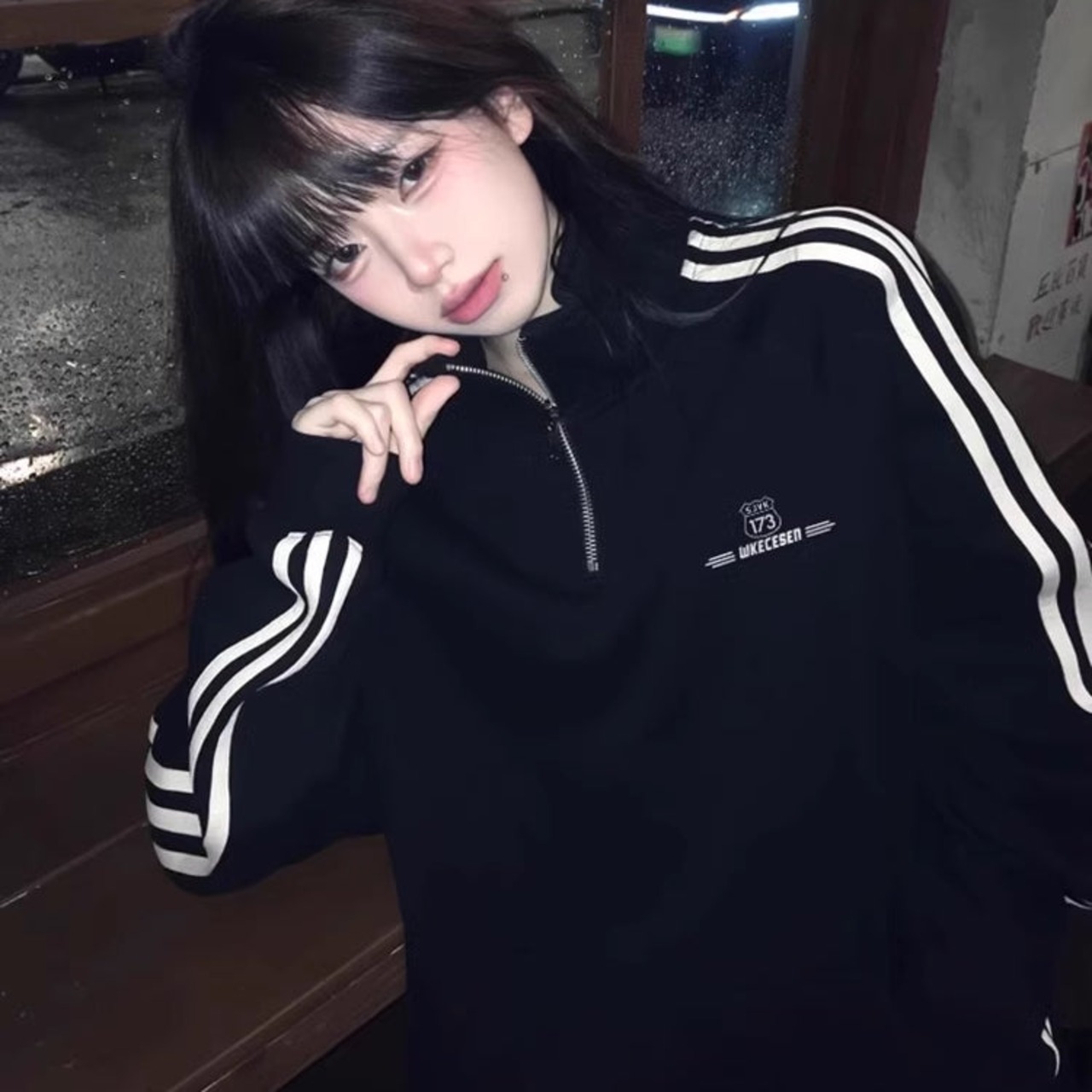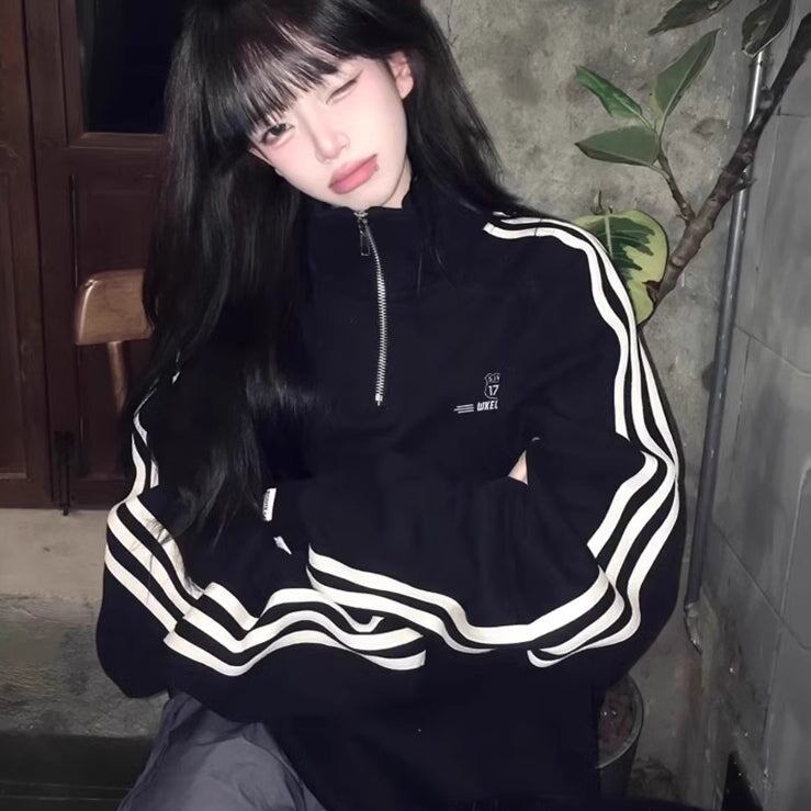 ハーフジップ スウェット トップス レディース サイドライン 韓国 ファッション スポーティ スタンドネックトレーナー