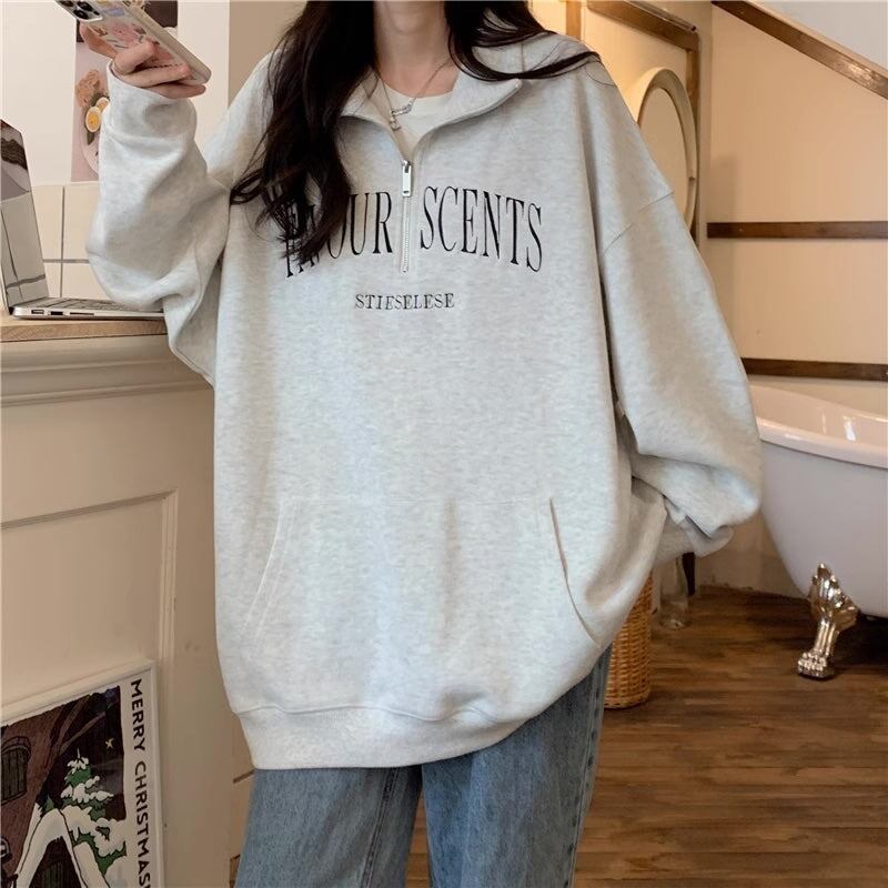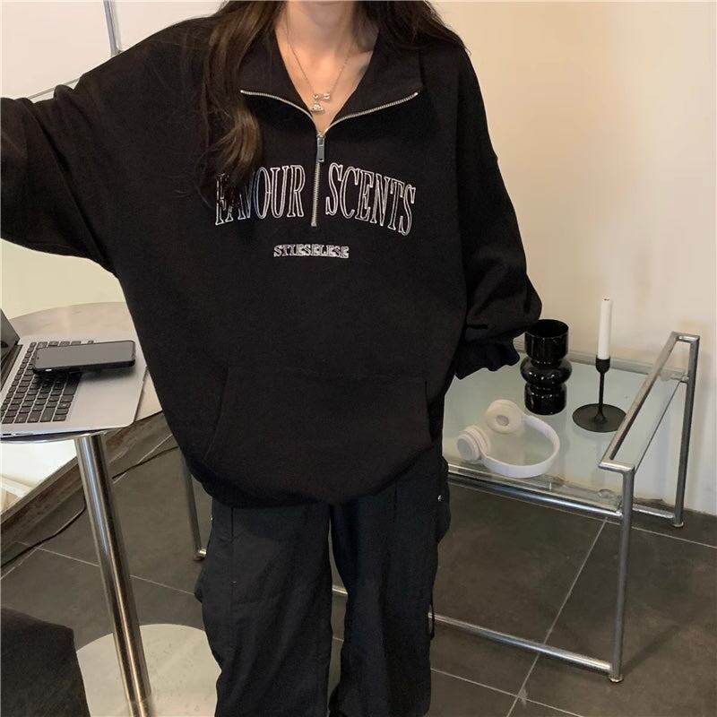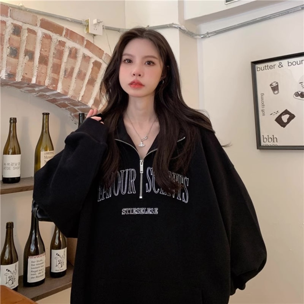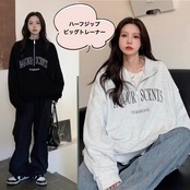 ハーフジップ スウェット トレーナー レディース 韓国 ファッション ロゴ ハイネック オーバーサイズ 秋冬 トップス