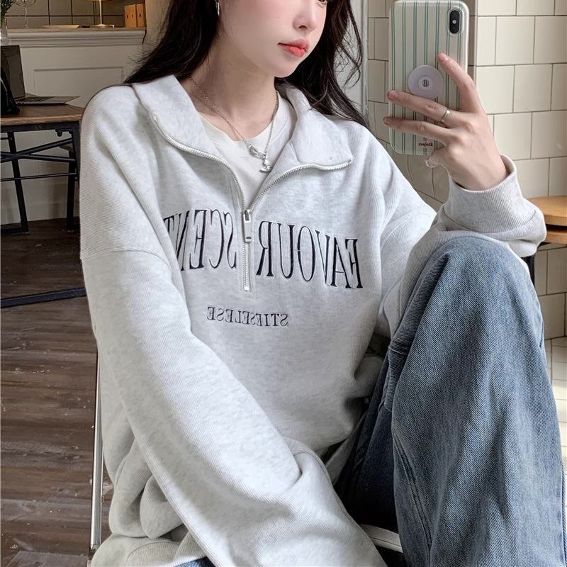 スウェット トレーナー レディース 韓国 ファッション ハーフジップ ロゴ ハイネック 長そで 刺繍ロゴ オーバーサイズ プルオーバー メンズライク