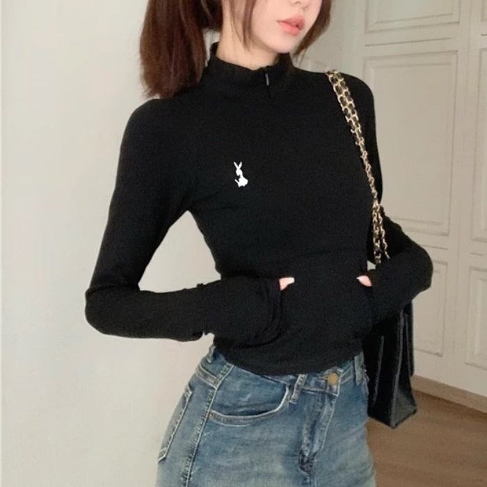 ハーフジップ ストレッチ ニット カットソー レディース 韓国 ハイネック 長袖 フロントポケット リブニット
