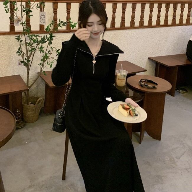 ハーフジップ フレア ワンピース 韓国 ファッション Aライン カットソー ハートチャーム ロングワンピース
