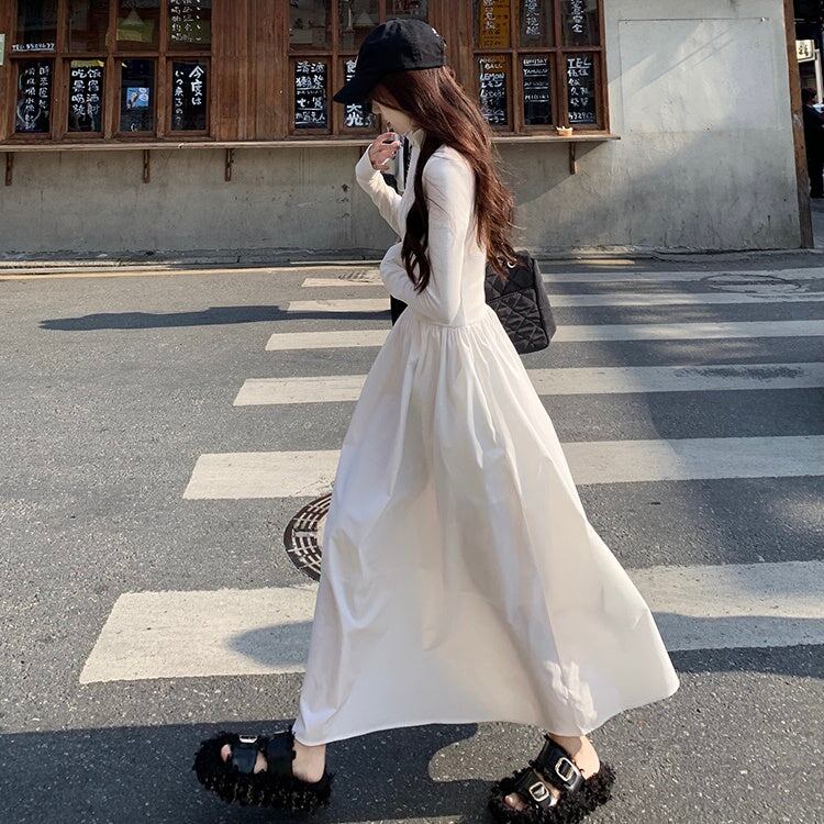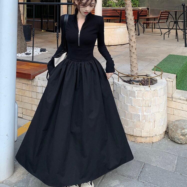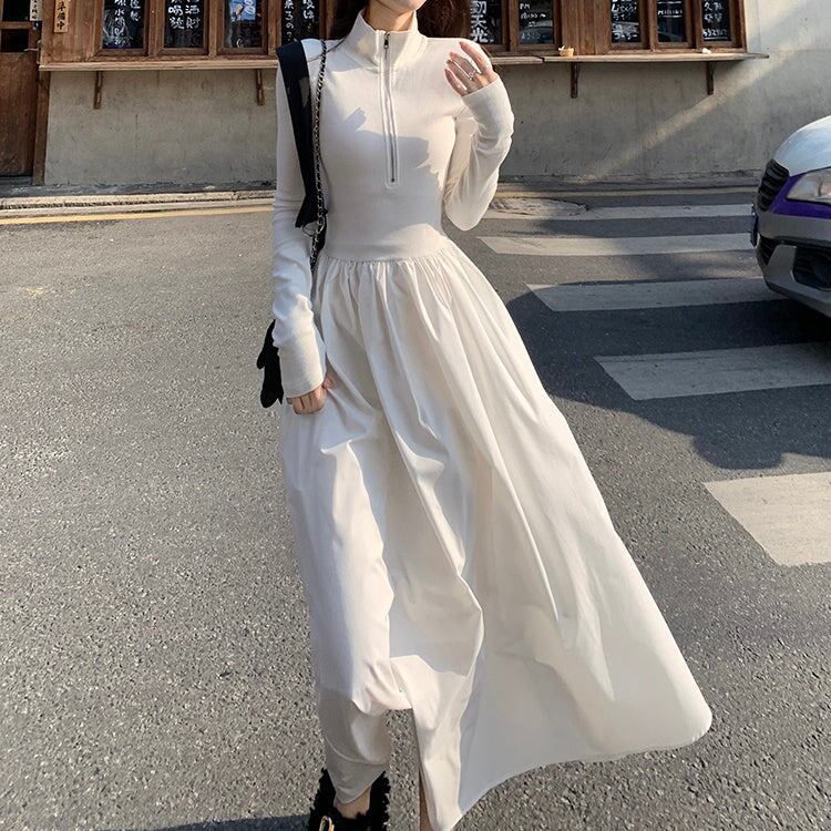ワンピース 切り替え 異素材 レディース 韓国 ファッション ハイネック ハーフジップ フレア Aライン ロングマキシ 長袖 エアリー