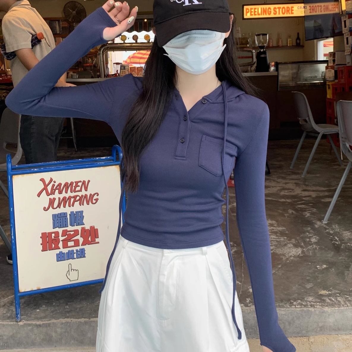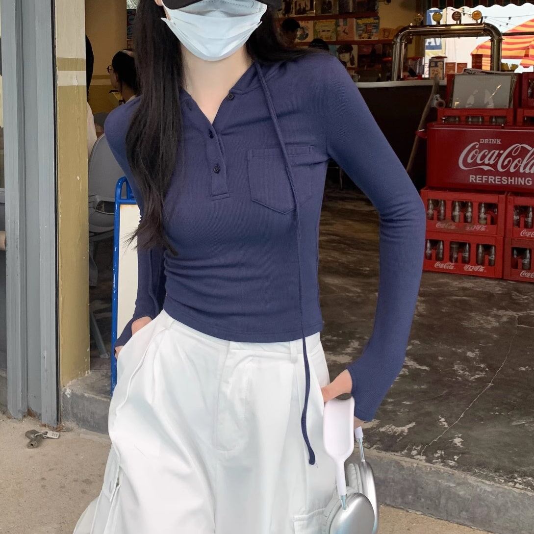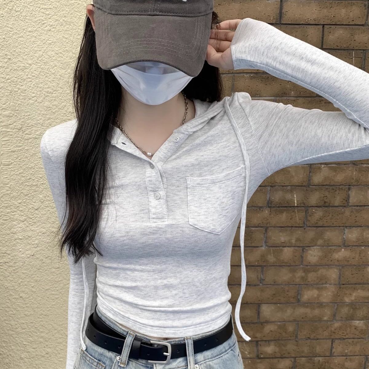 パーカー Tシャツ レディース 韓国 ファッション ストレッチ クロップド ヘンリーネック フードトップス ストレッチタイト ショートトップス