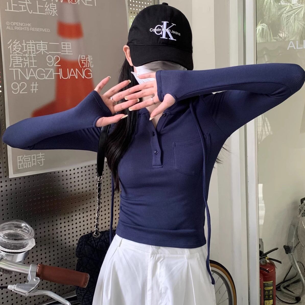 パーカー カットソー レディース 韓国 ファッション ストレッチ タイト クロップド丈 ヘンリーネック ロンT