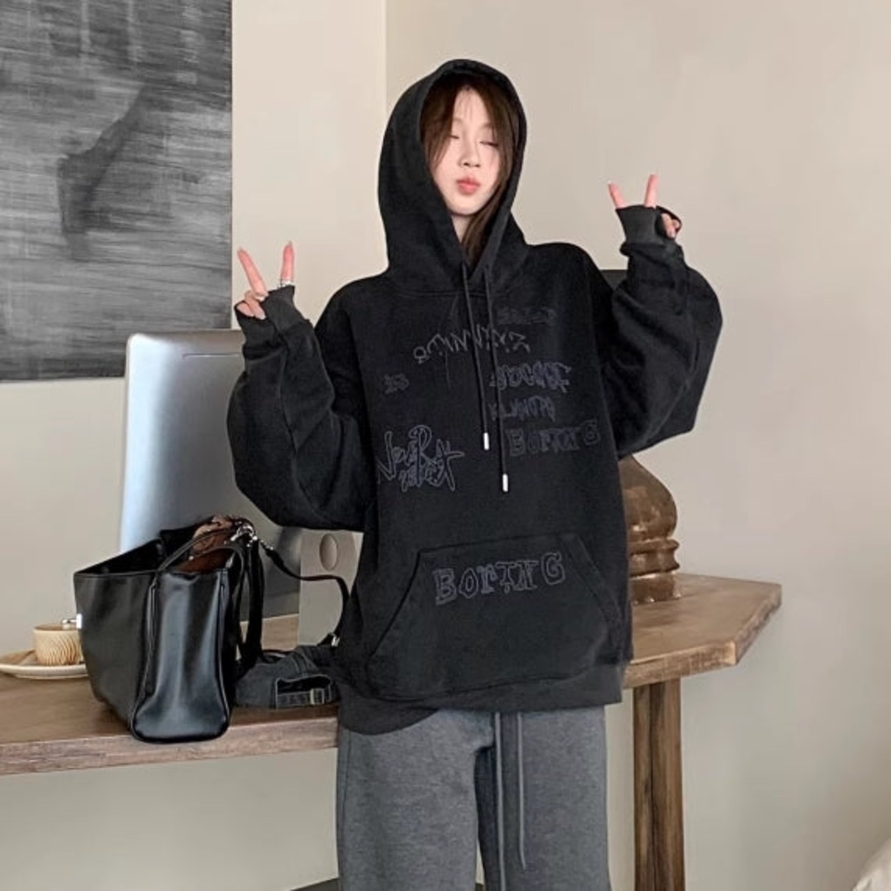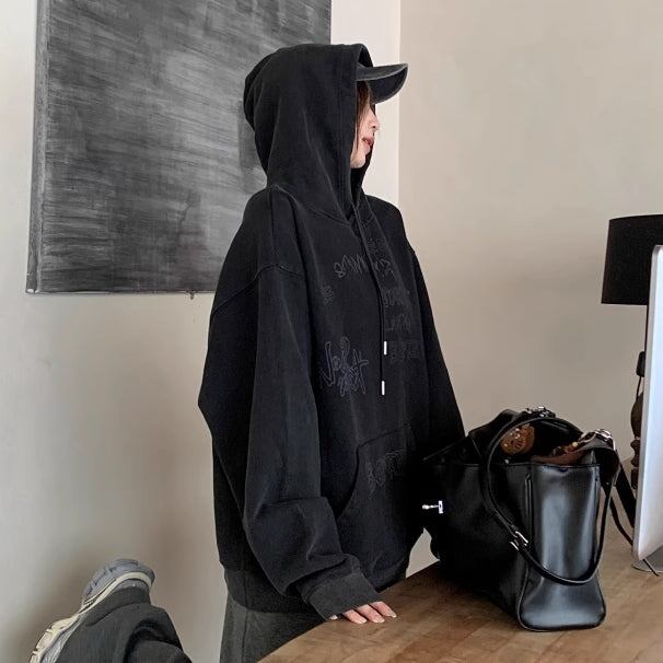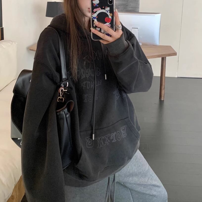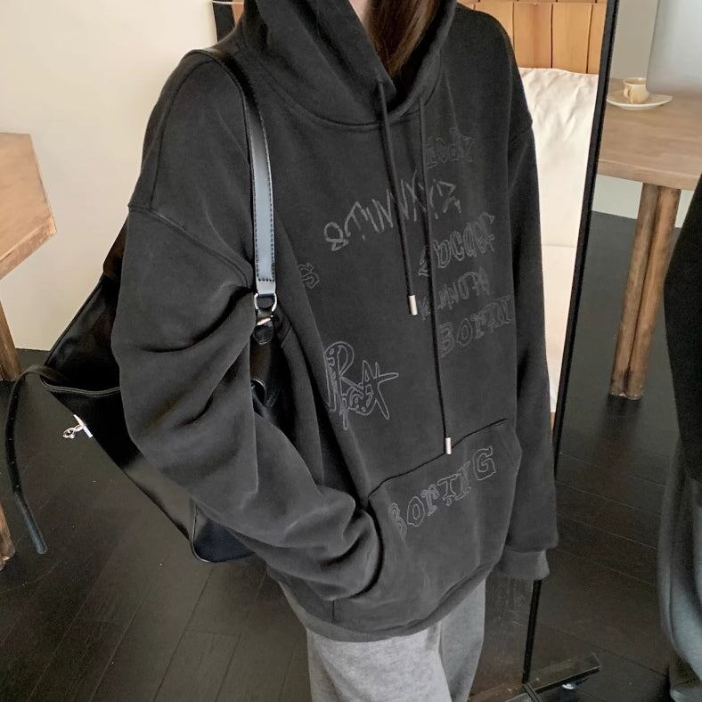 パーカー プルオーバ— レディース 韓国 ファッション 落書きロゴ シンプル おしゃれ 黒パーカー アッシュブラック ビンテージ 色あせ加工