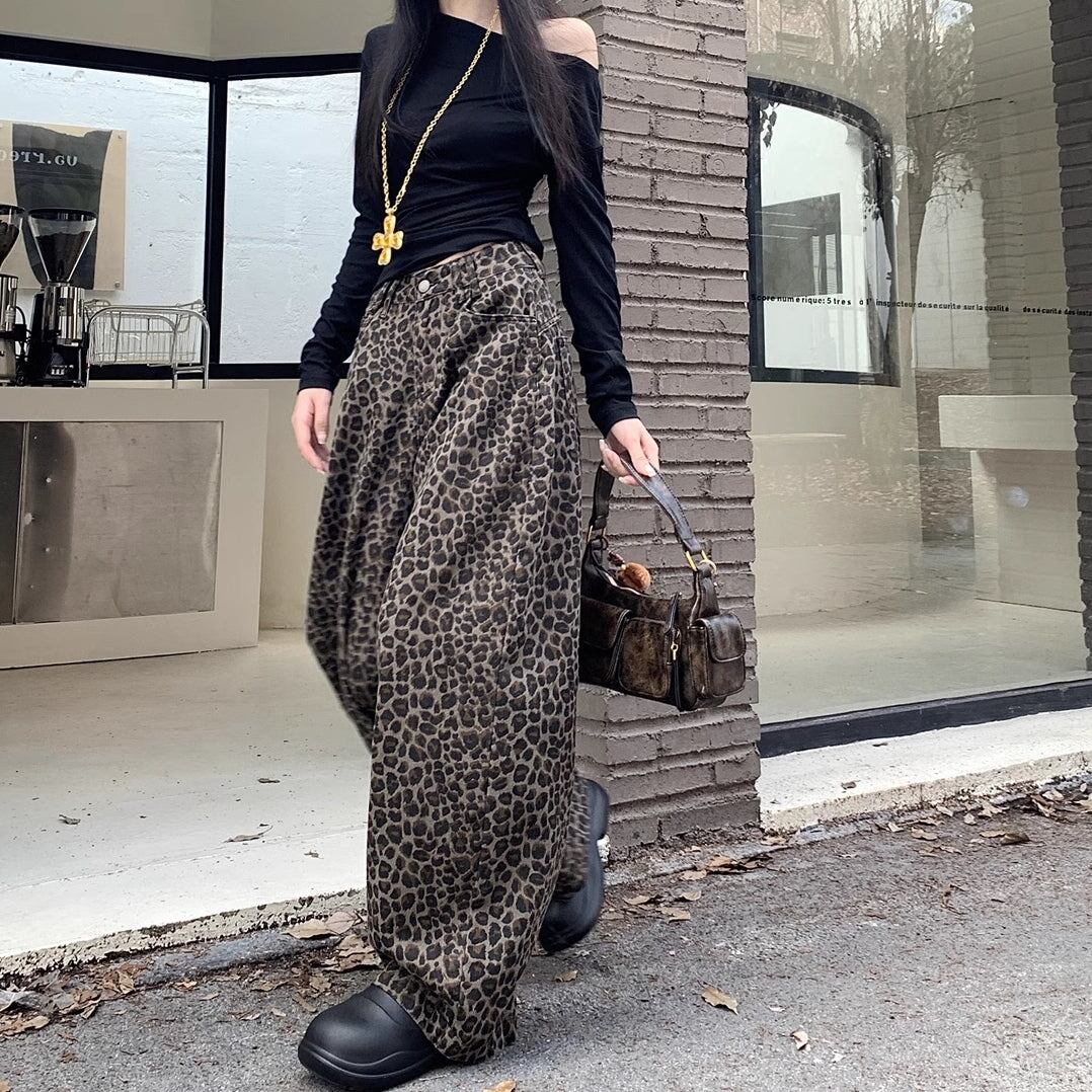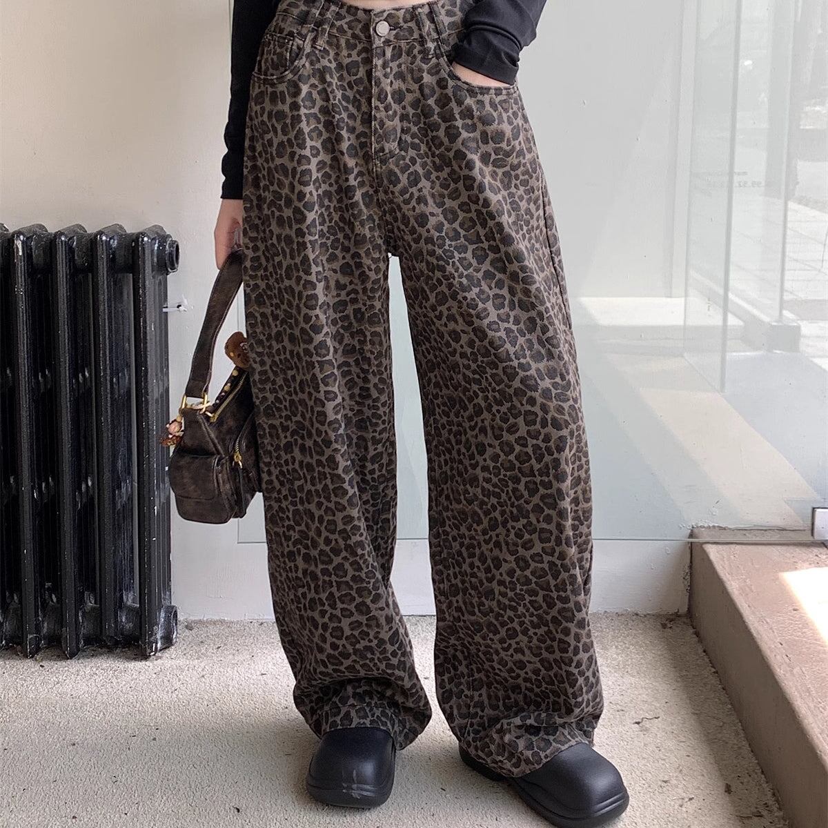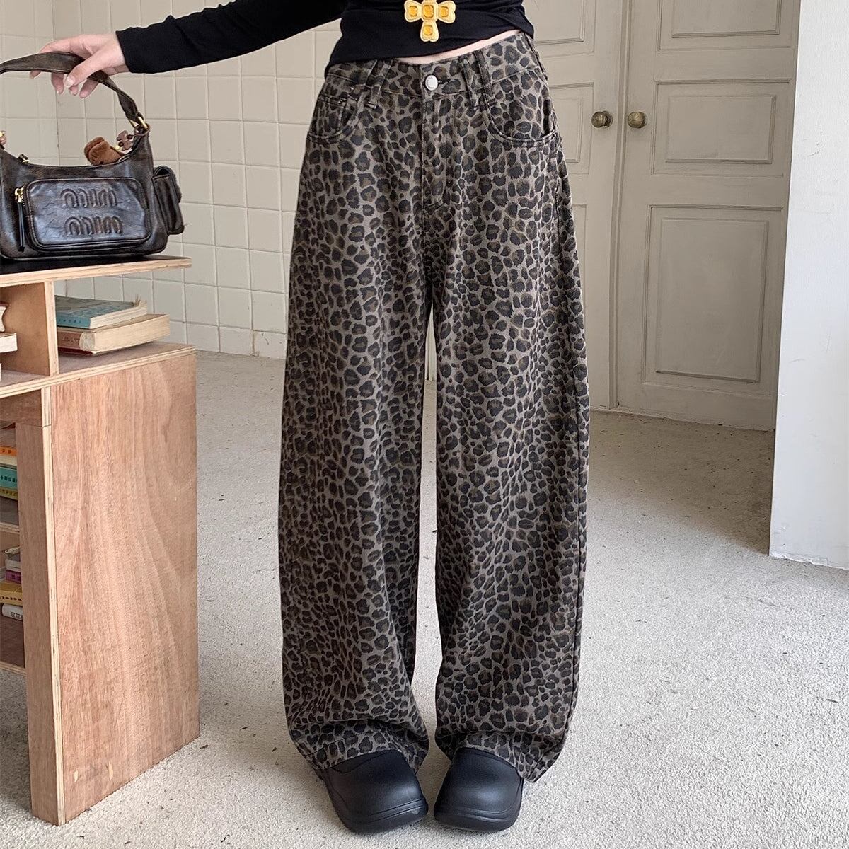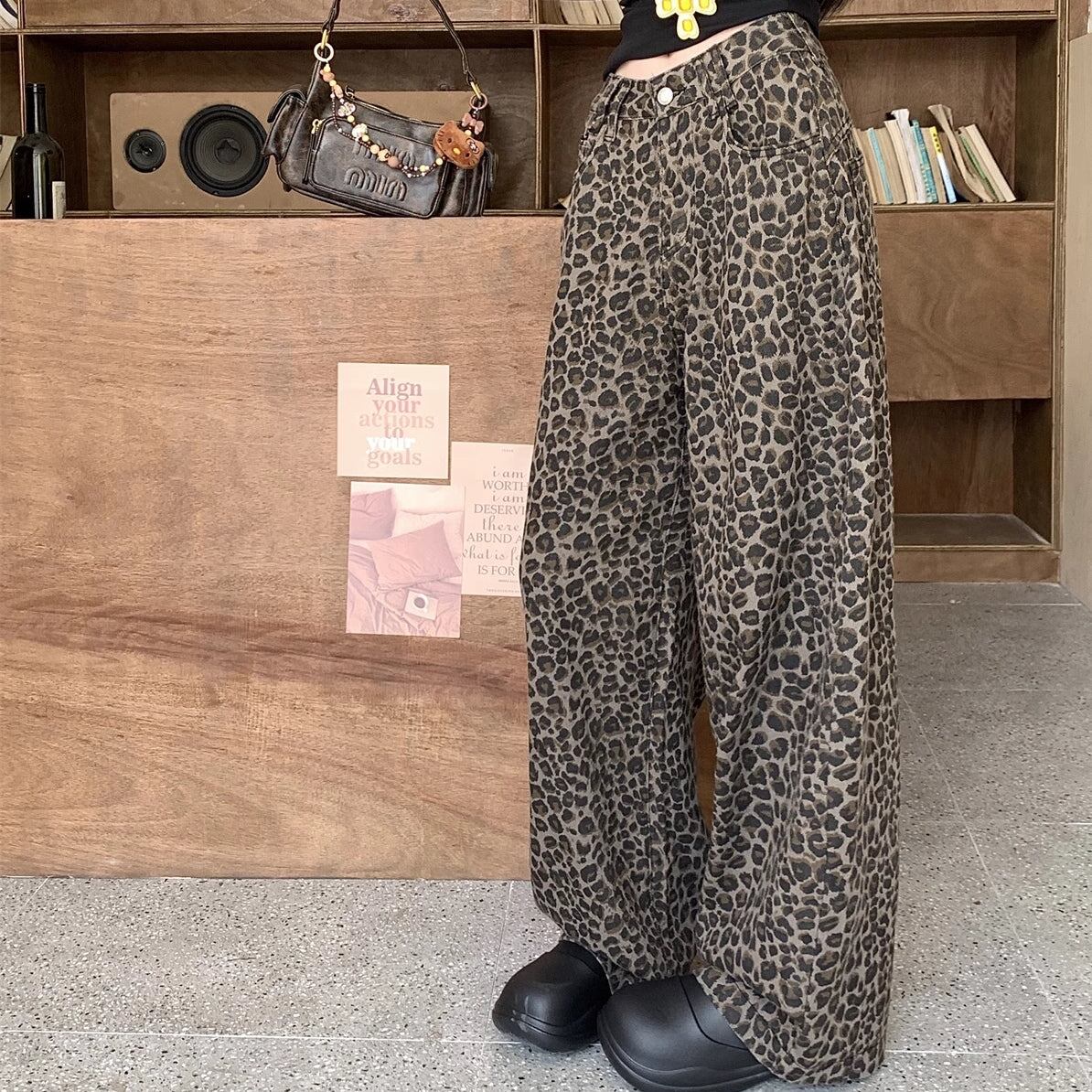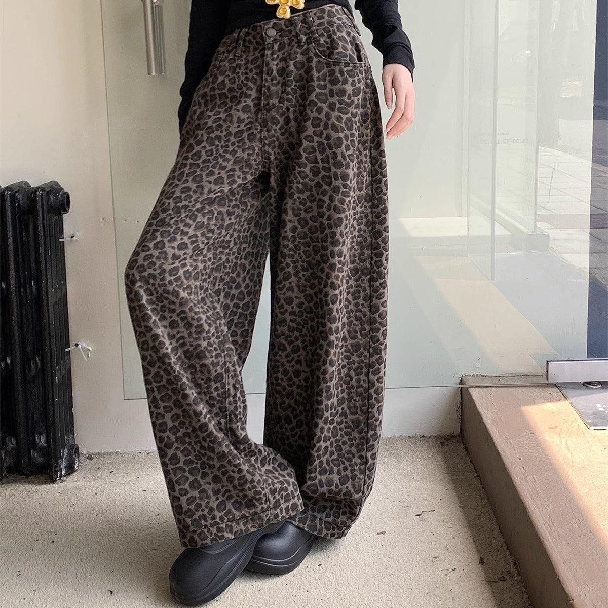 デニムパンツ ヒョウ柄 レディース 韓国 ファッション ワイドシルエット モップパンツ アニマル柄 レオパード かわいい
