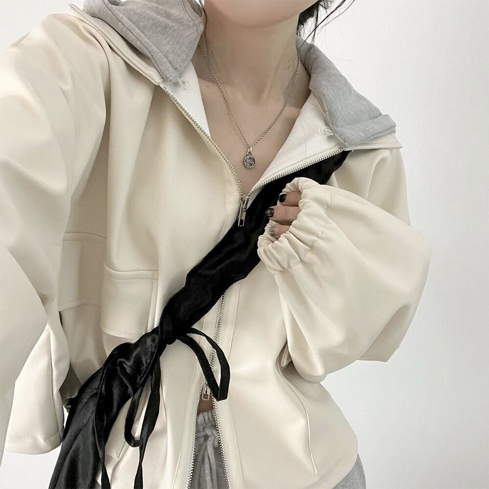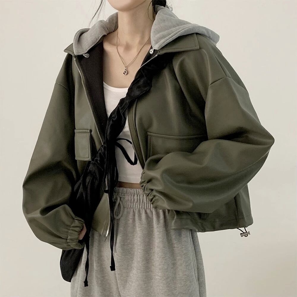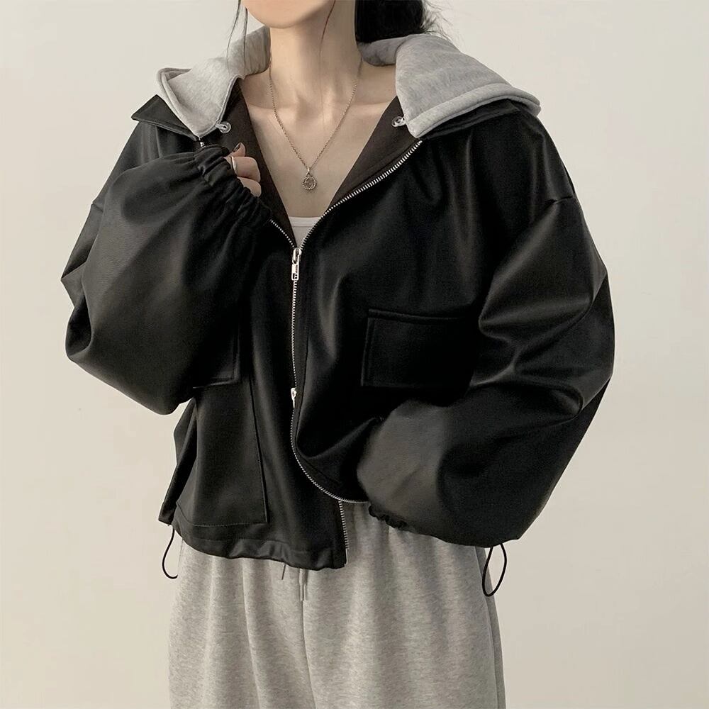 フェイクレザー ジャケット ブルゾン レディース スウェットパーカー ドッキング 韓国 ファッション エコレザー オーバーサイズ ジャケット