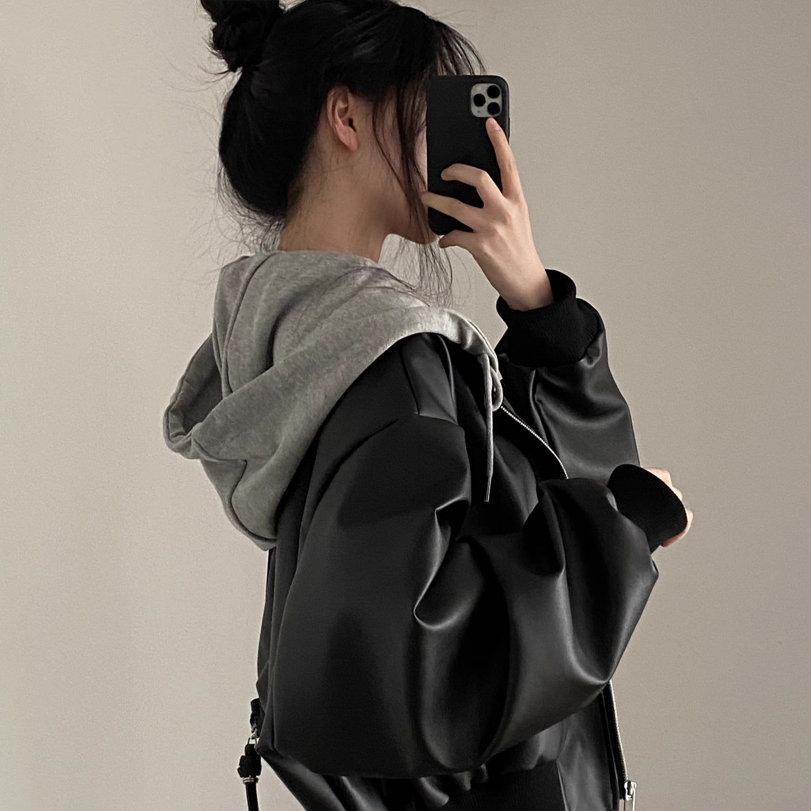 グレーフード付きのフェイクレザー♪オーバーサイズ