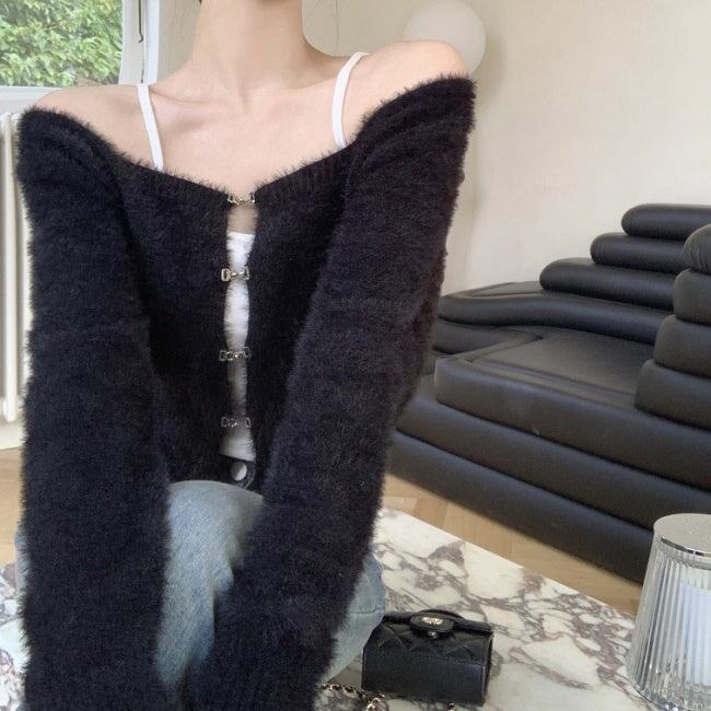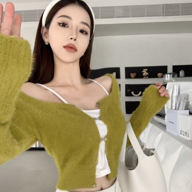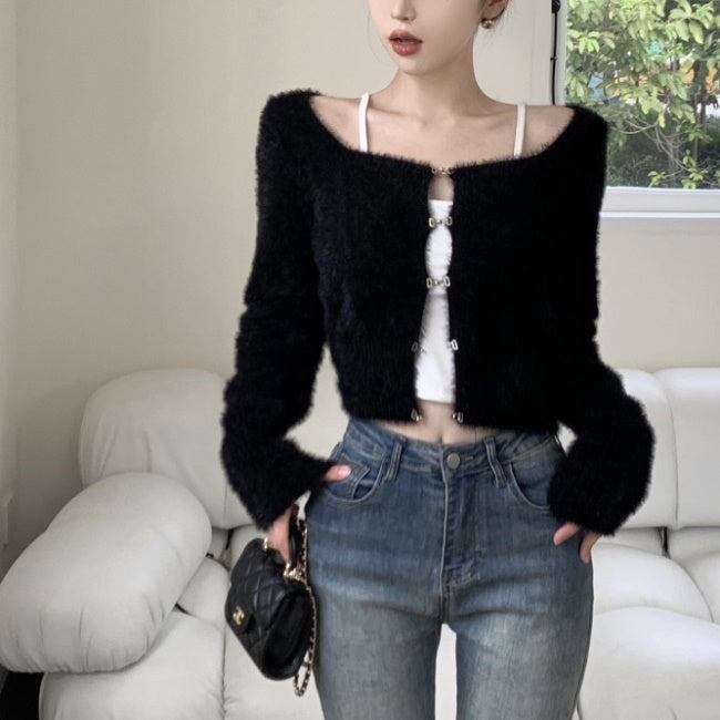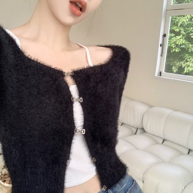 フックボタン ショート ニットカーディガン 韓国 ファッション 毛足ニット クロップド ニット トップス 秋冬