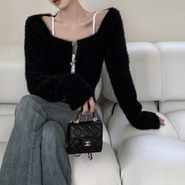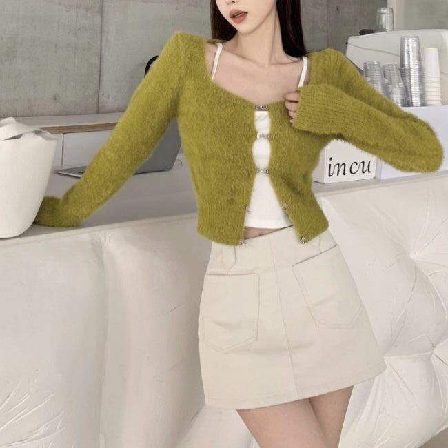 ニット カーディガン ショートトップス レディース 韓国 ファッション 毛足ニット ショートカーディガン 黒 グリーン スクエアネック ミニマムトプス 秋冬ac07030