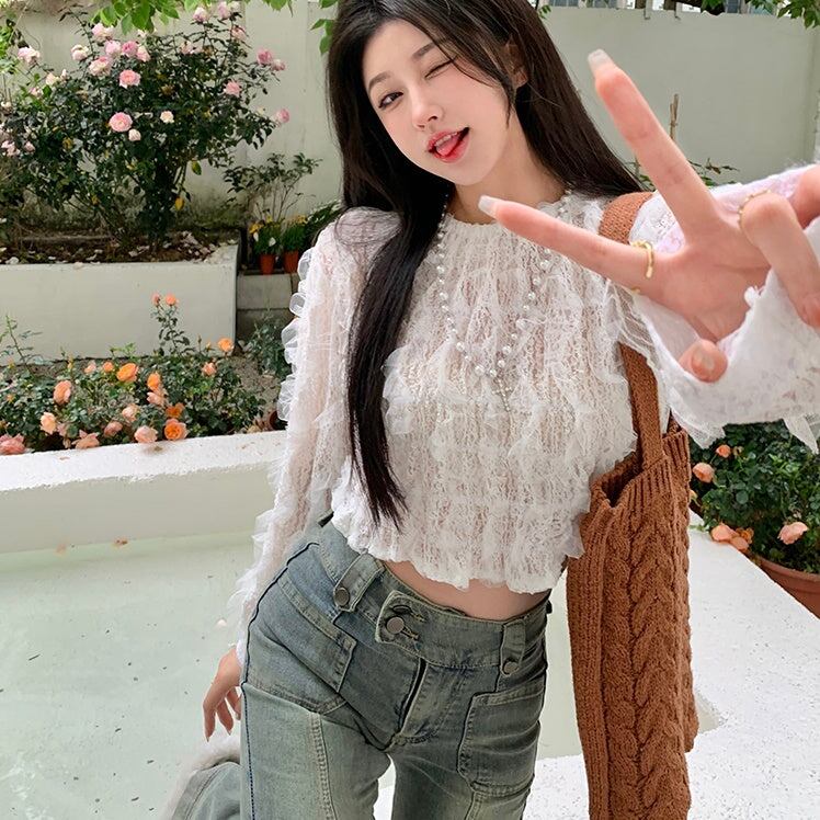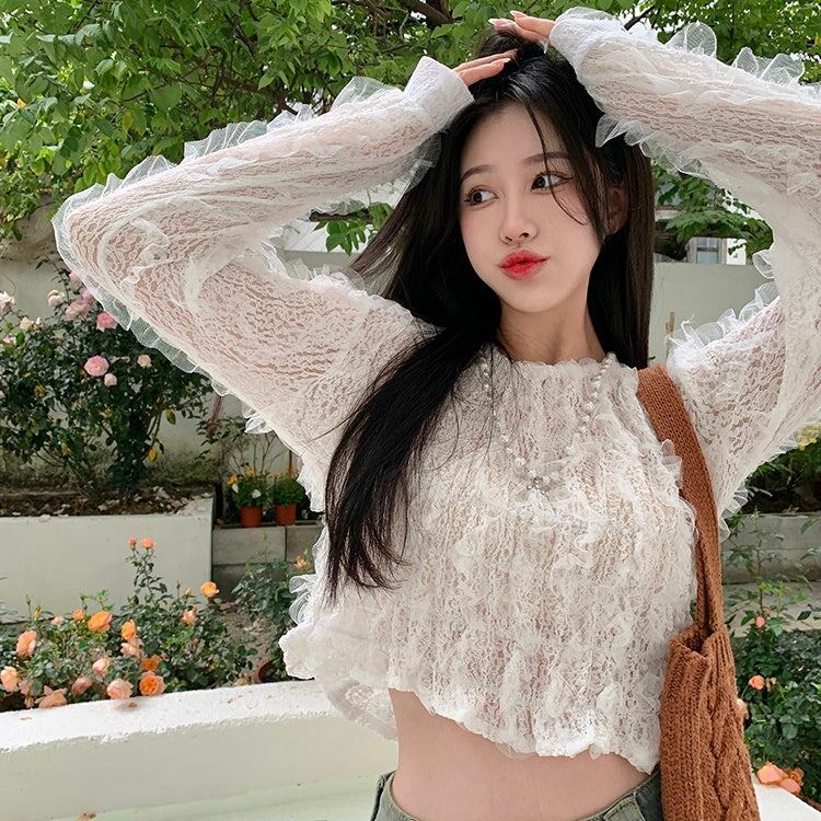 フリル シアー クロップド ブラウス 韓国 ファッション プルオーバー フェミニン シースルー ショート ブラウス
