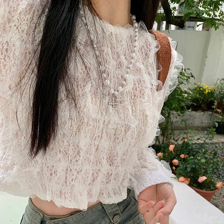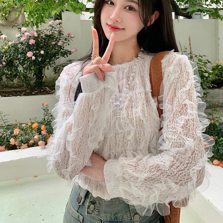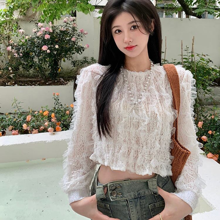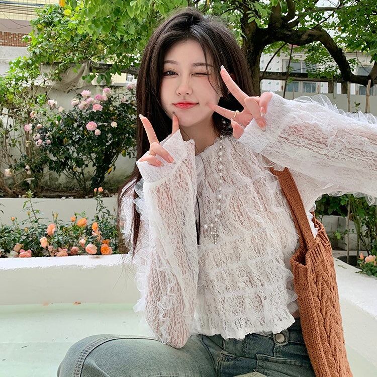 白ブラウス フリルトップス レディース 韓国 ファッション クロップトップス カットソー プルオーバー フェミニン すけ感 シアーメッシュ レース