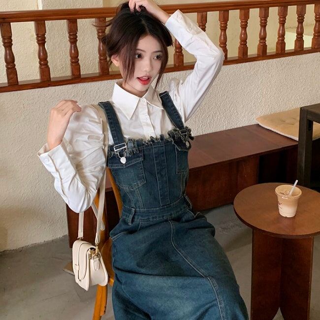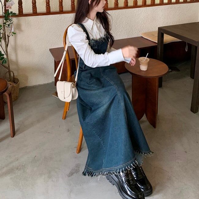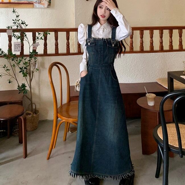 フリンジ デニム ジャンパースカート レディース ブラウス セット 韓国 ファッション レトロ マキシ ワンピース