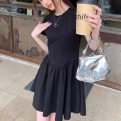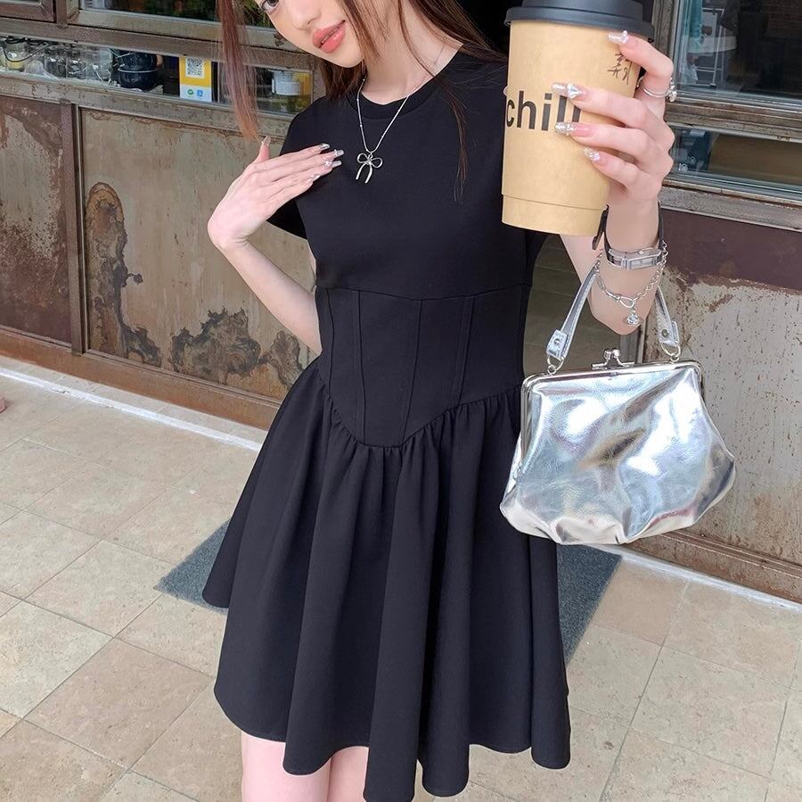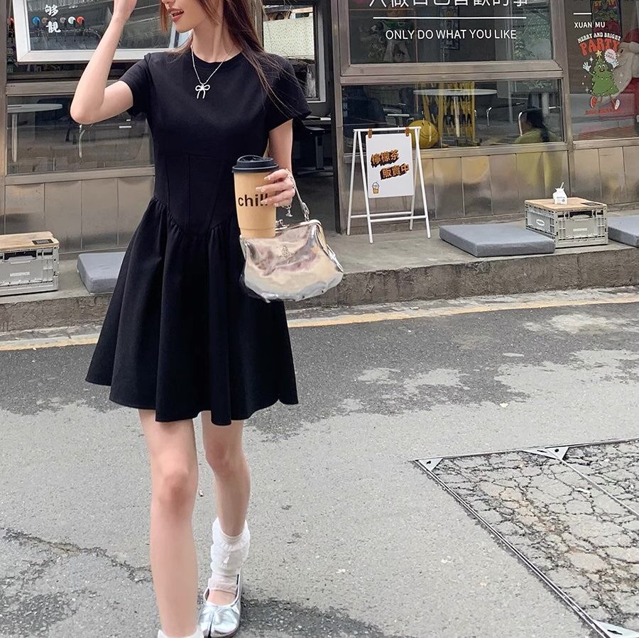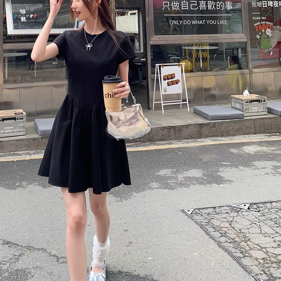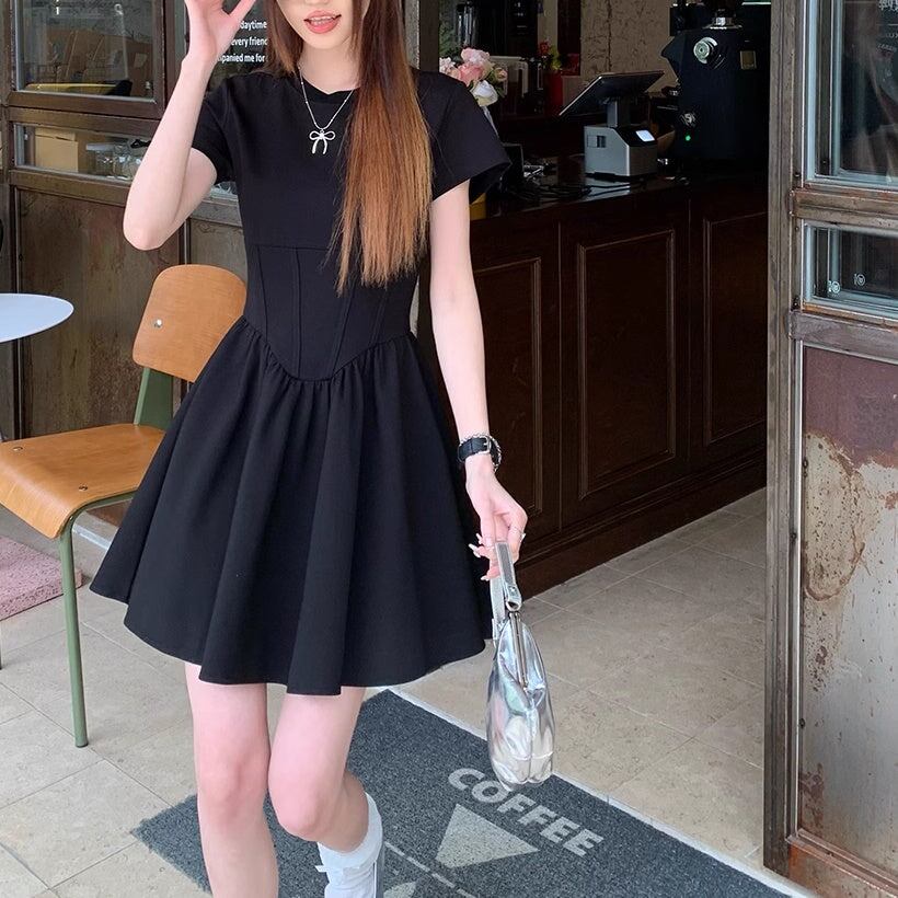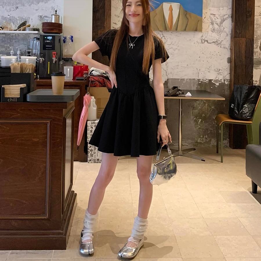 フレア ミニワンピース レディース 韓国 ファッション ストレッチ タイト 半袖 ミニワンピ 黒シンプル