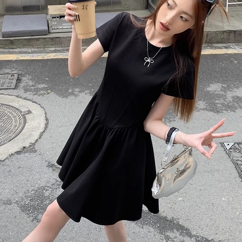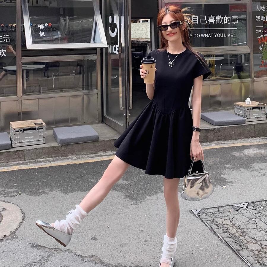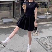 ワンピース レディース 韓国 ファッション ストレッチ フレア ミニワンピース 黒ワンピ カジュアル シンプル Tシャツワンピ