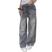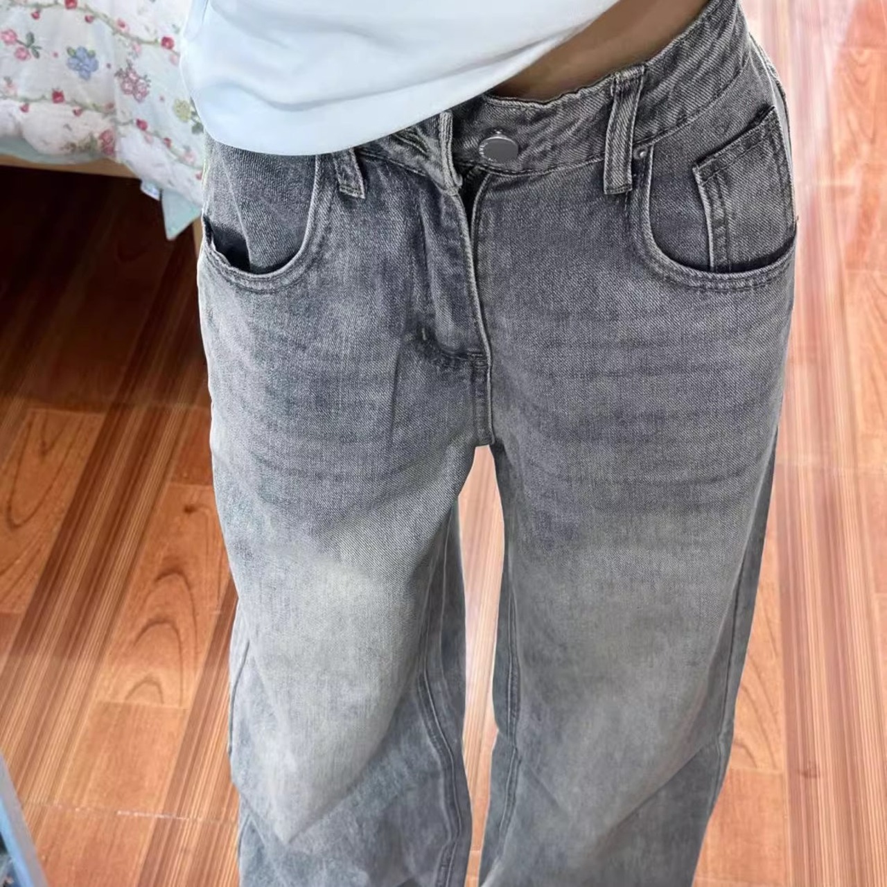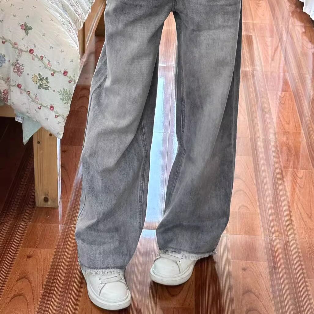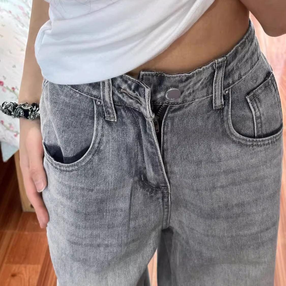ブラック デニムパンツ レディース 韓国 ファッション ダメージ加工 ワイドデニム ライトグレー