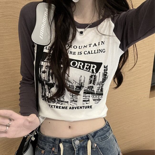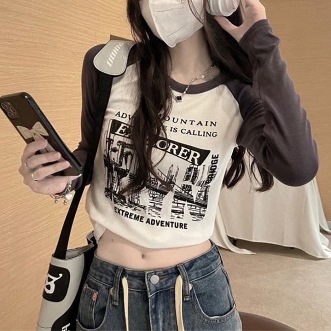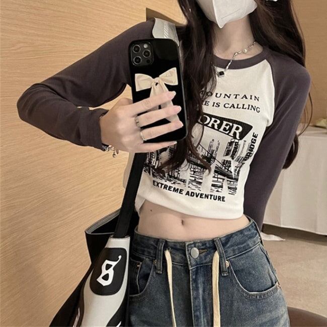 プリント ラグラン ロンT レディース クロップド丈 韓国 ファッション クロップトップ アメカジ 長袖 トップス