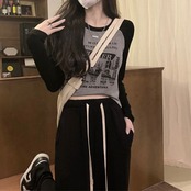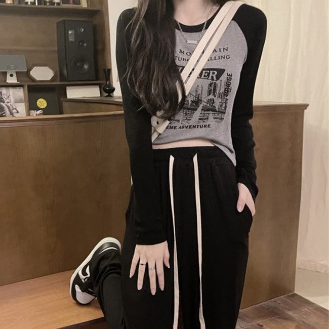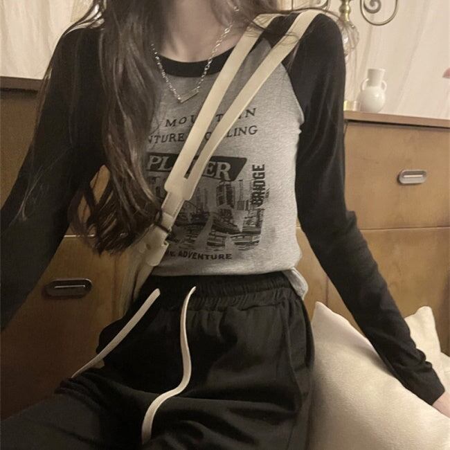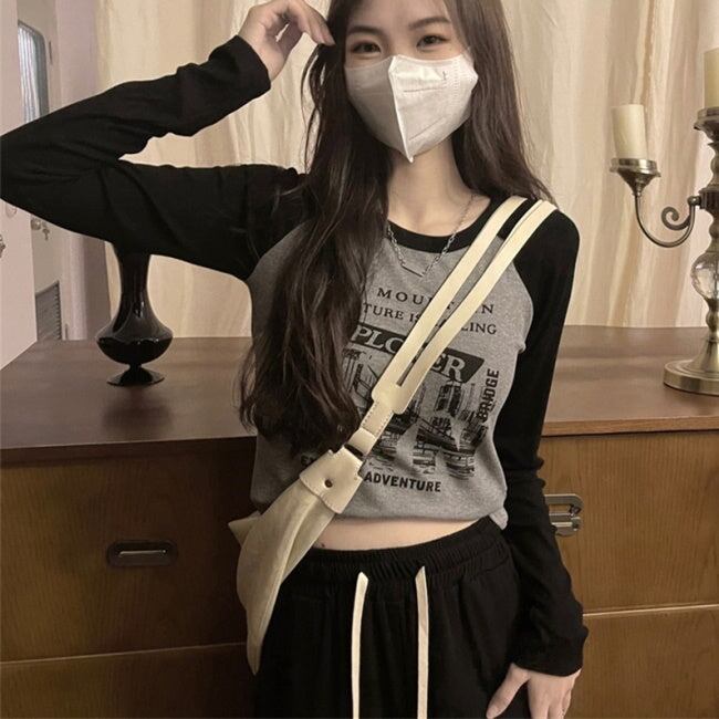 Tシャツ ラグラン レディース 韓国 ファッション クロップトップ プリント アメカジ 長袖 トップス プルオーバー タイト ロゴプリント