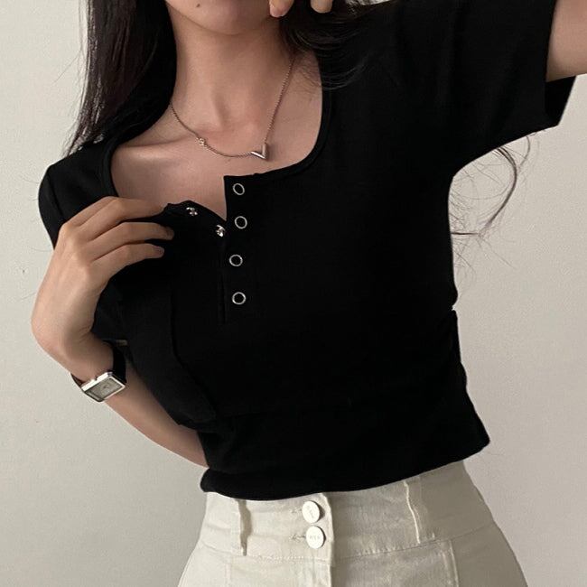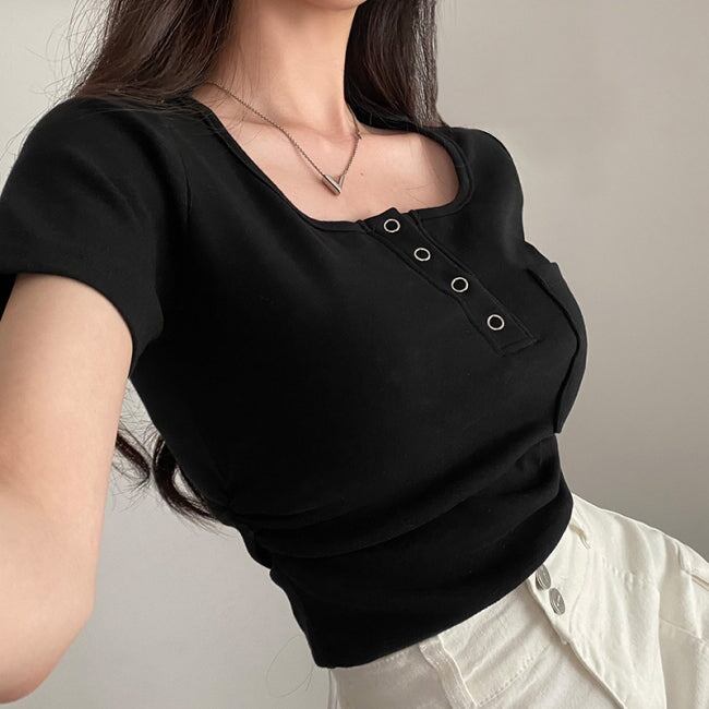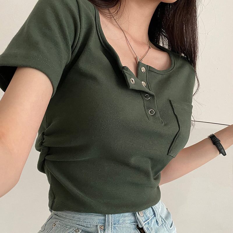 ヘンリーネック ボタン Tシャツ 半袖 カットソー レディース クロップド トップ レディース 韓国 ファッション ショート丈 リブカットソー
