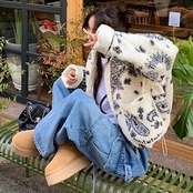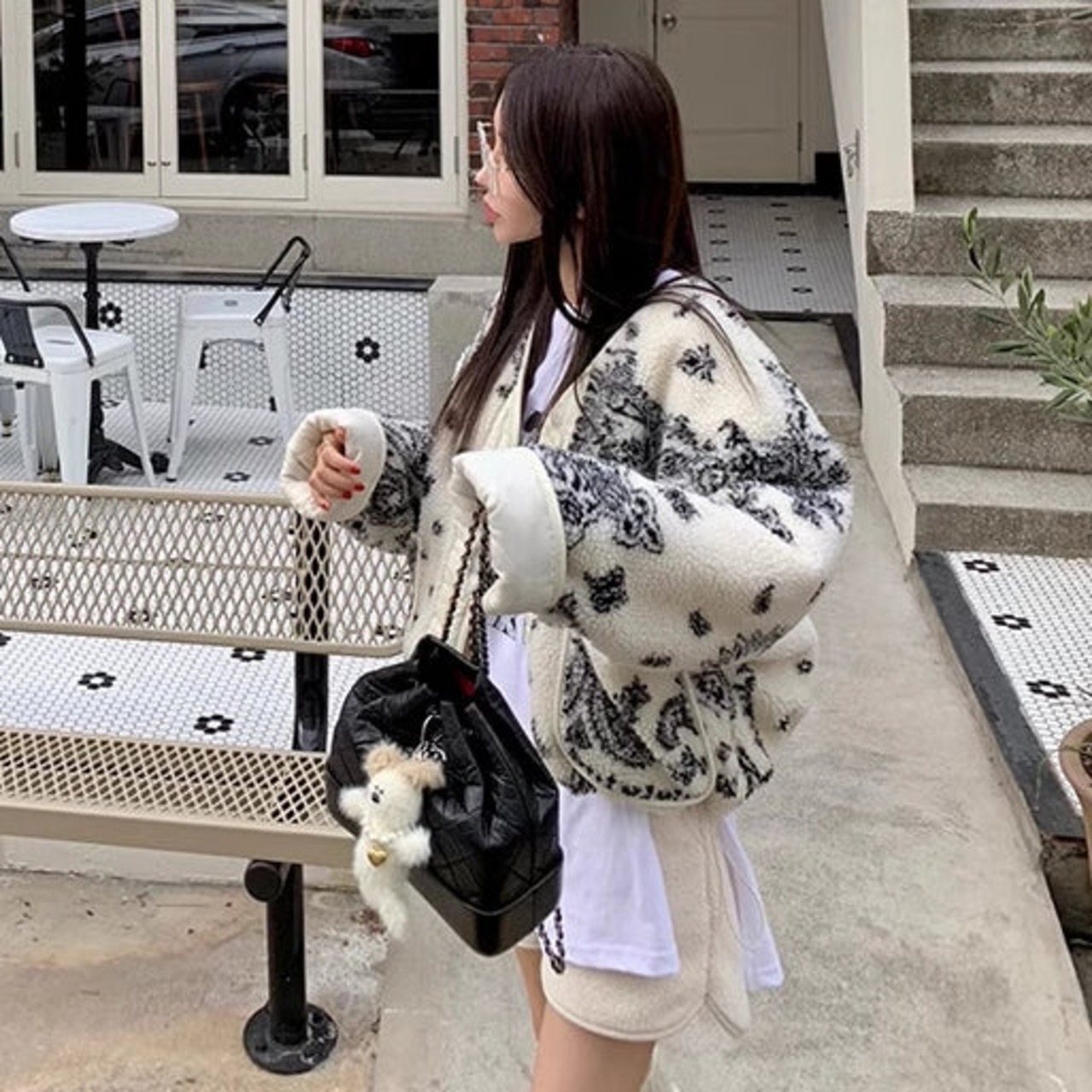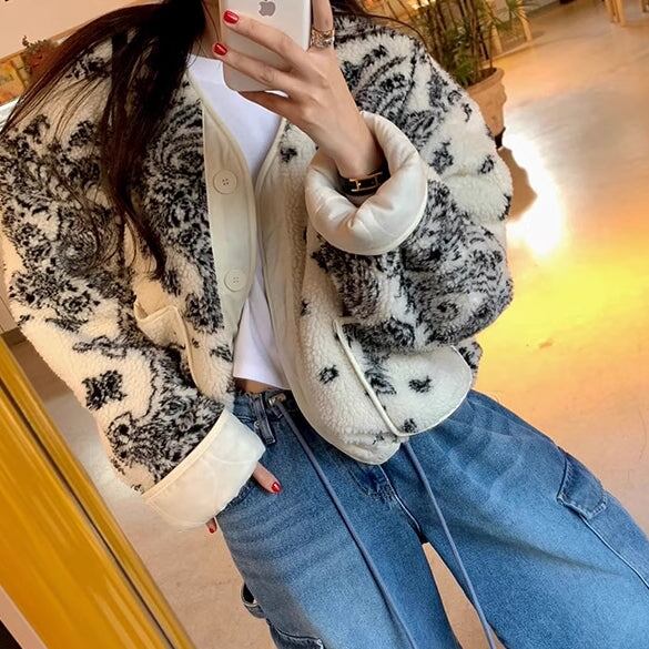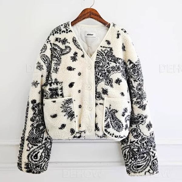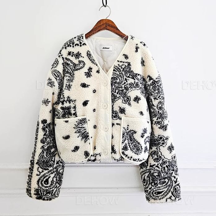 フリースアウター ペイズリー レディース 韓国 ファッション 柄アウター キルティング ボタンフロント 柄プリント ポケット