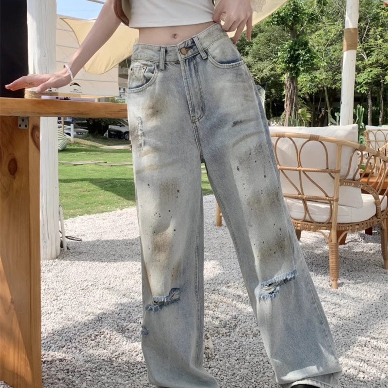 ペイント ダメージ加工 ワイド デニムパンツ レディース 韓国 ファッション ヴィンテージ クラッシュ デニム