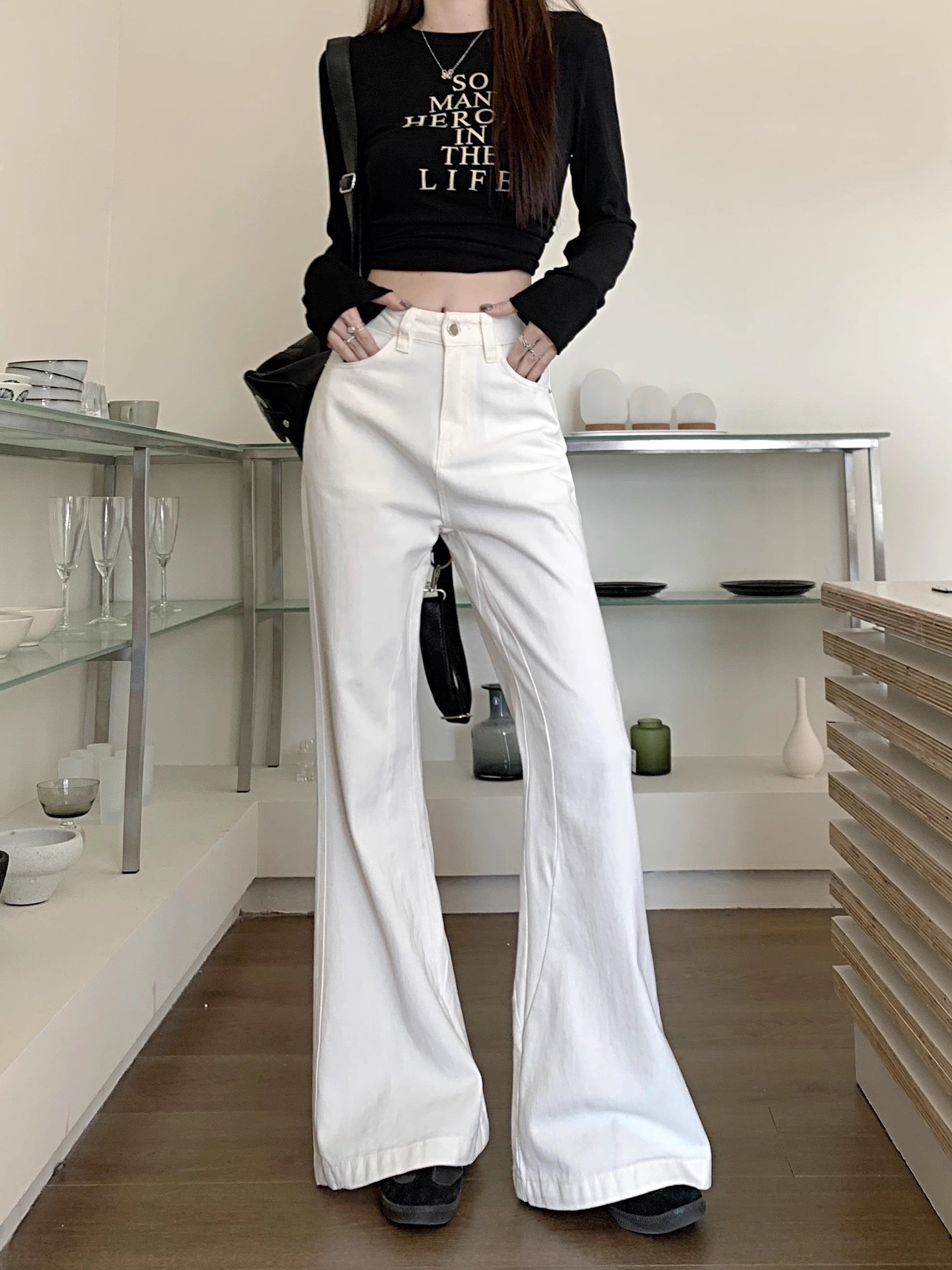 裾広がりのフレアシルエットがおしゃれなホワイトデニムパンツです