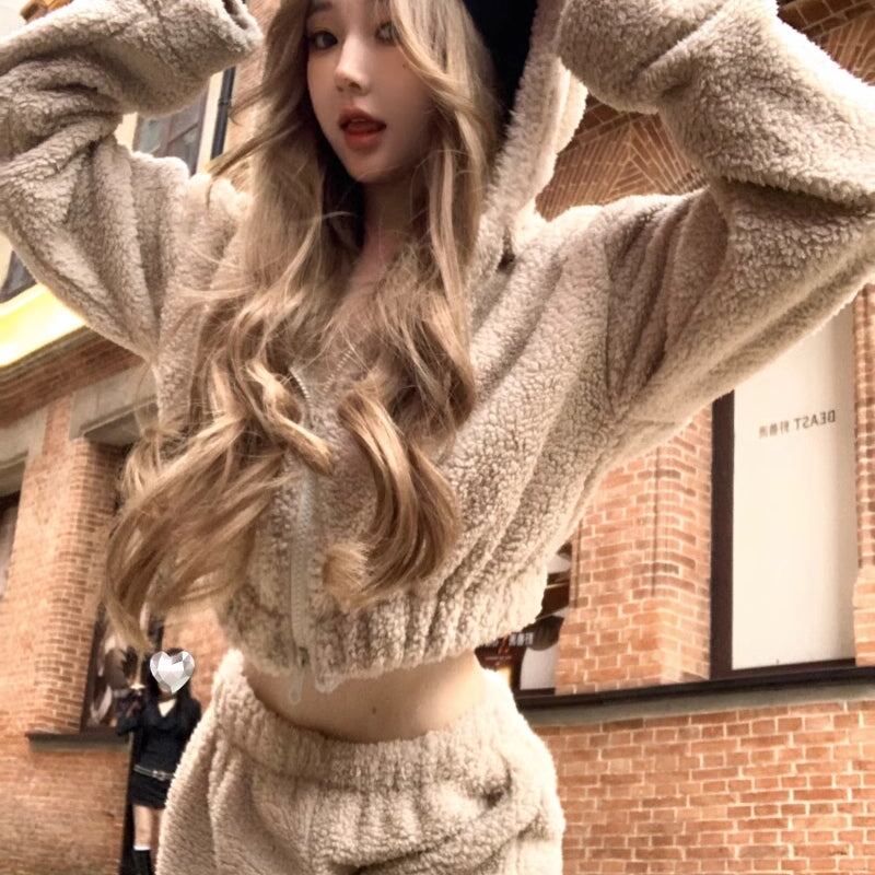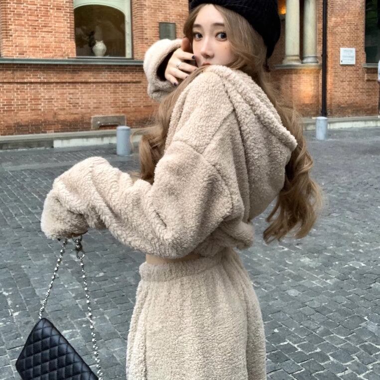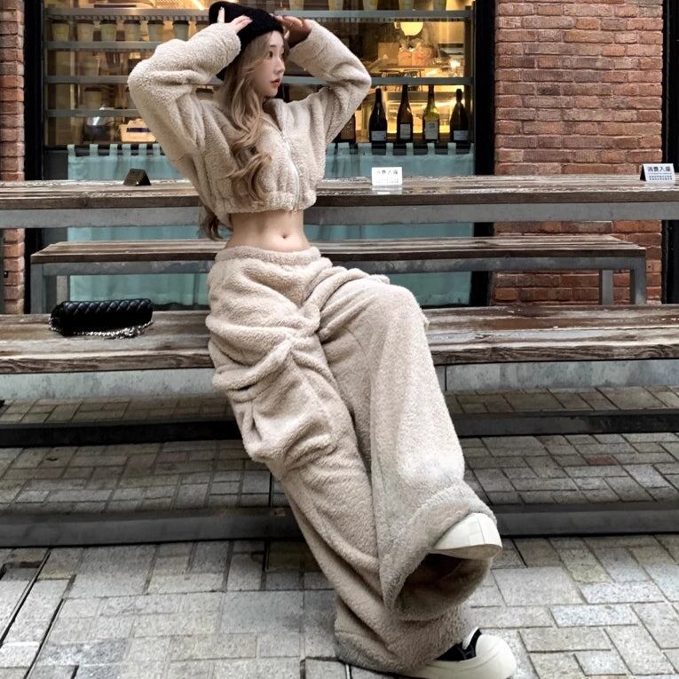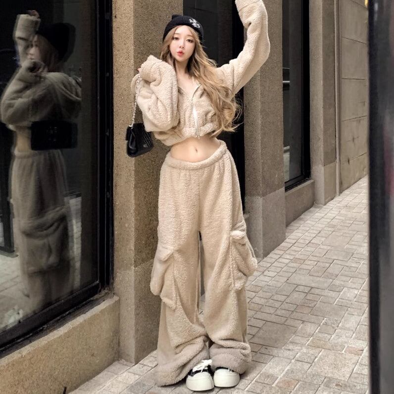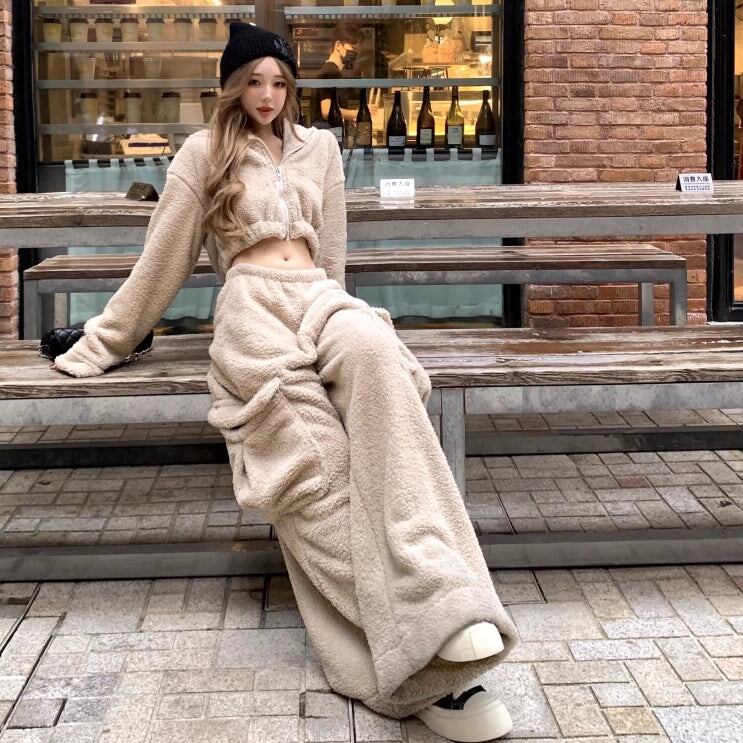 セットアップ ボア スウェット レディース 韓国 ファッション フリース上下セット クロップドパーカー カーゴパンツ サイドポケット ワイドパンツ ボアパンツ 冬セット