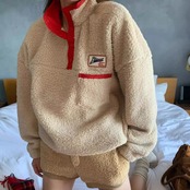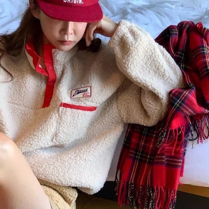 ボアトレーナー レディース 韓国 ファッション ロゴパッチ もこもこ パイピング ビッグシルエット ハーフボタン ボア トップス