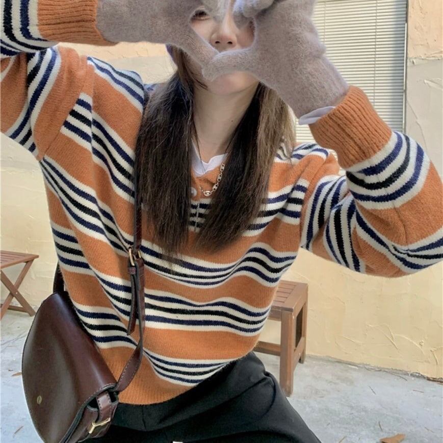ボーダー ポロ ニット レディース 韓国 ファッション レトロ マルチボーダー プルオーバー カラフル 柄ニット