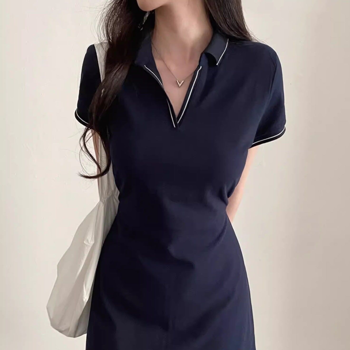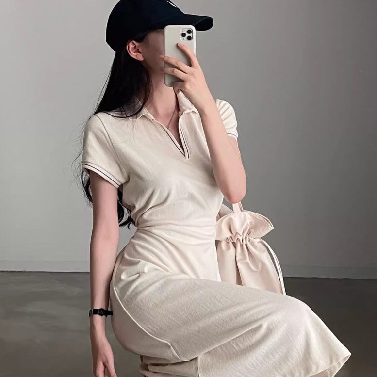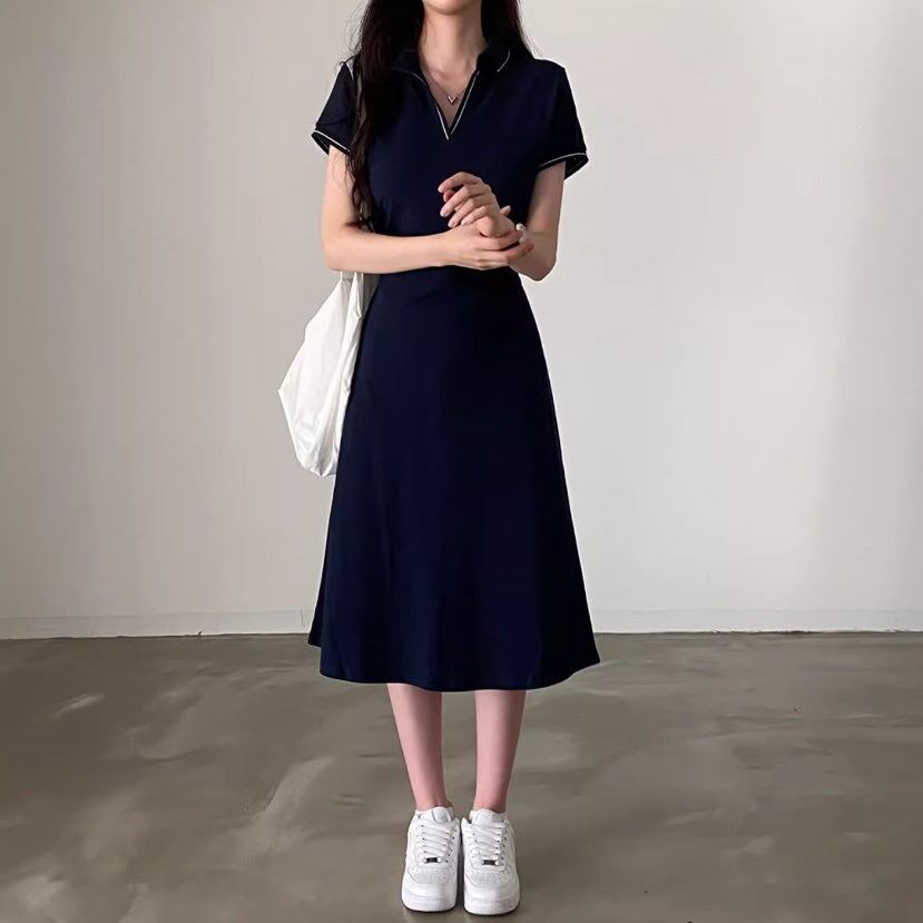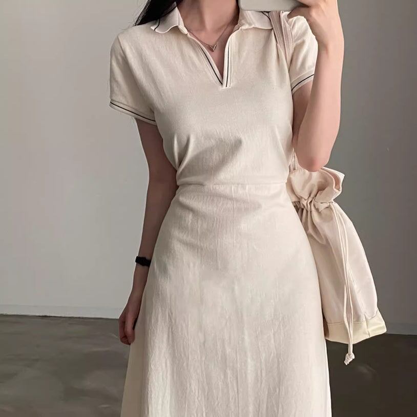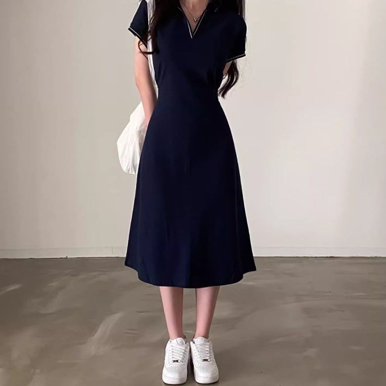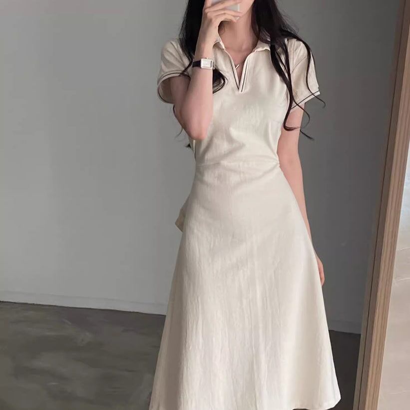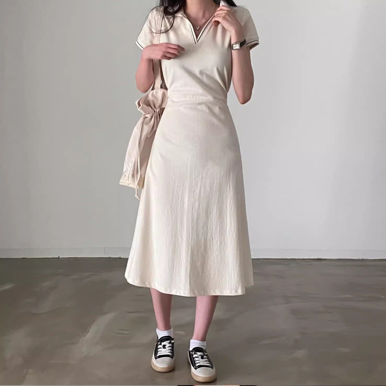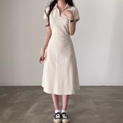 ポロワンピース フレア 韓国 ファッション スキッパー Aライン バックリボン Vネック ひざ下丈 ロングワンピース