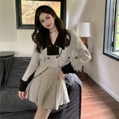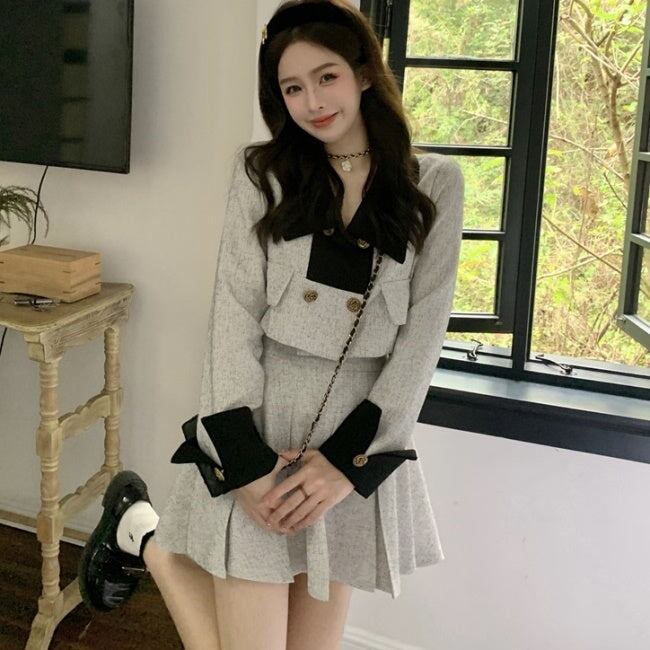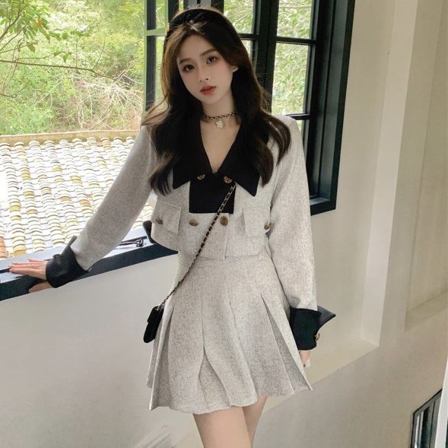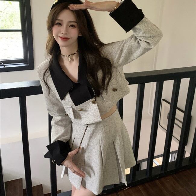 スーツ セットアップレディース 韓国 ファッション プリーツスカート クロップトップ シャツジャケット ミニスカート 春コーデ バイカラー 長袖 ツーピース お呼ばれ 女子会