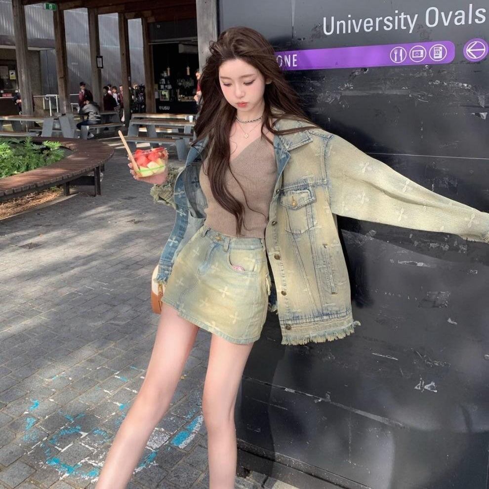 モノグラム デニム セットアップ レディース 韓国 ファッション ヴィンテージ デニムジャケット ミニスカート 上下セット