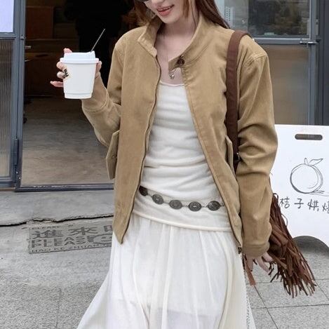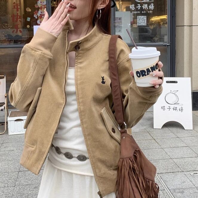 ライダース コーデュロイ ブルゾン レディース 韓国 ファッション ワンポイント ロゴ レトロ ジャケット