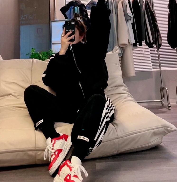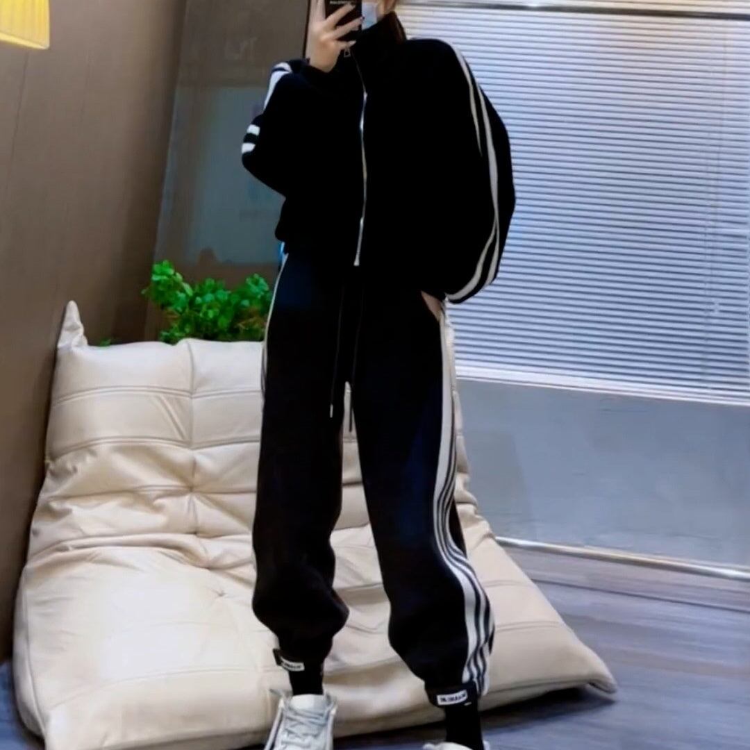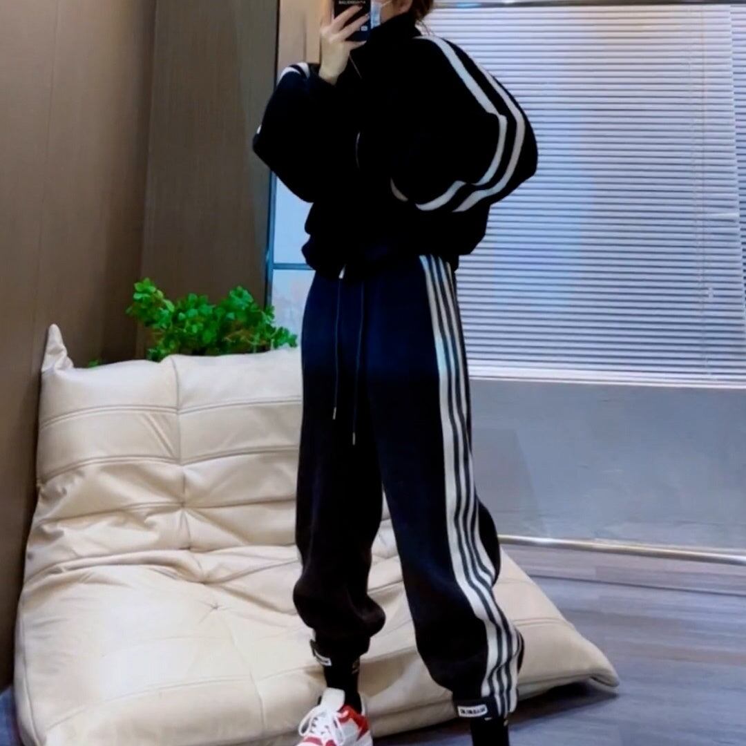 ジャージ セットアップ レディース 韓国 ファッション サイドライン 黒ジャージ トラックトップ スリムパンツ ラインパンツ スポーツ カジュアル