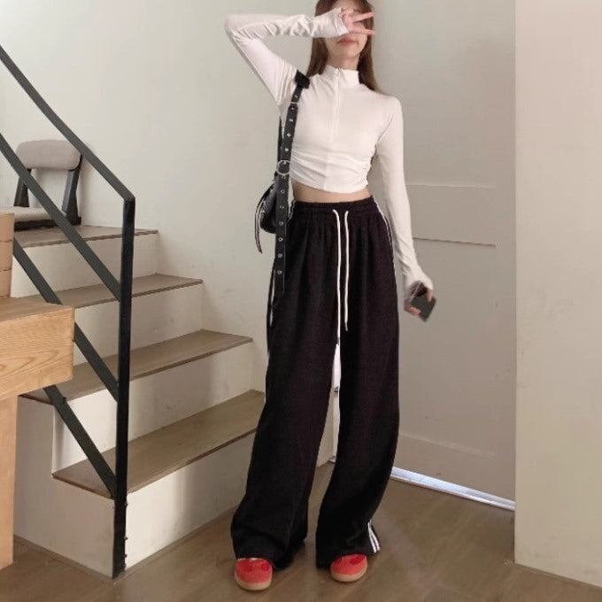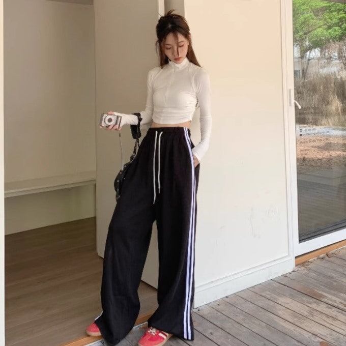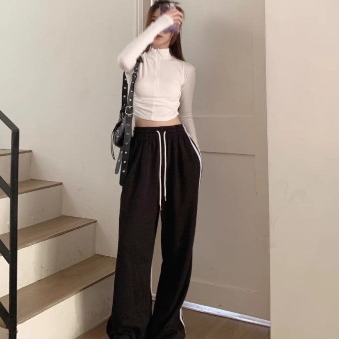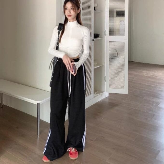 セットアップ ハイネックTシャツ ラインパンツ レディース 韓国 ファッション サイドライン ハーフジップ 長袖 タイト ミニマム ワイドパンツ ジョガーパンツ