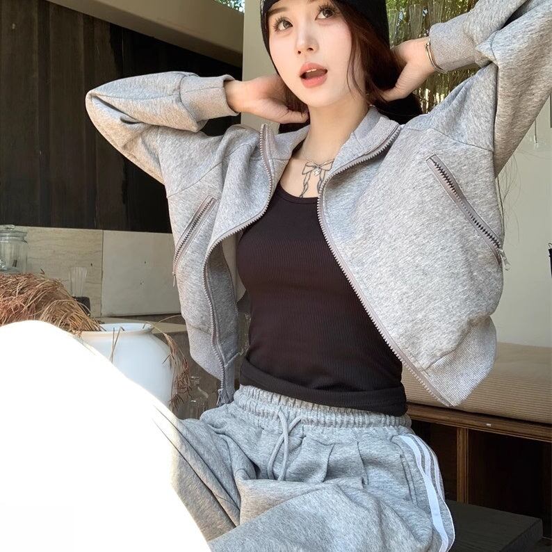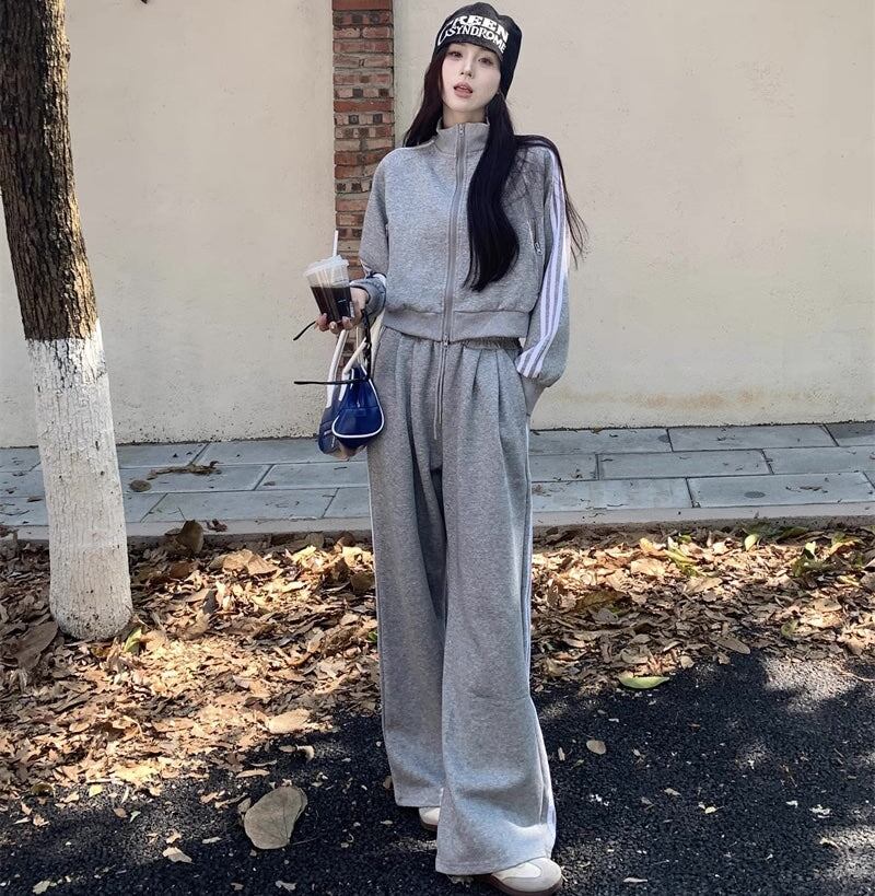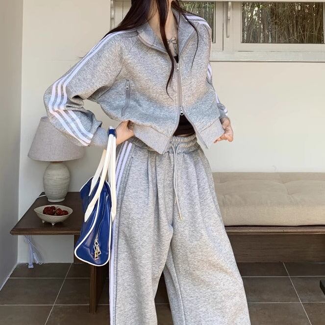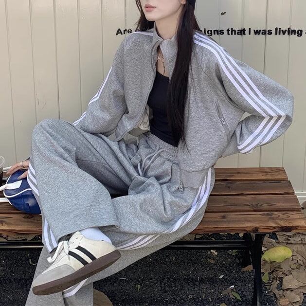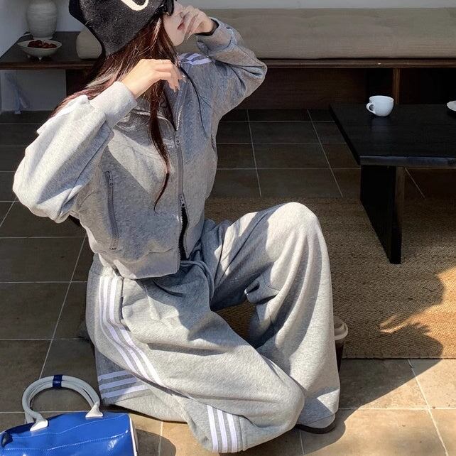 セットアップ サイドライン レディース 韓国 ファッション クロップジャケット ジップブルゾン ワイドパンツ グレースウェット