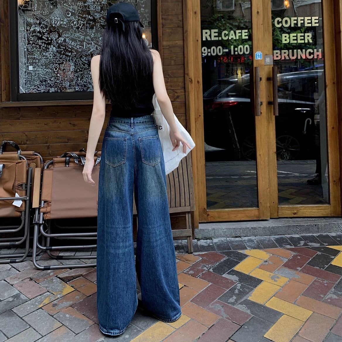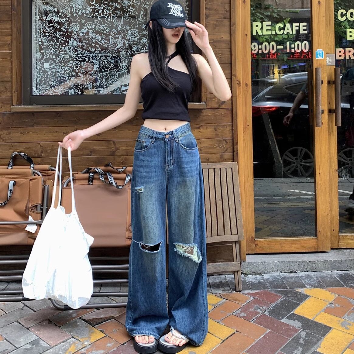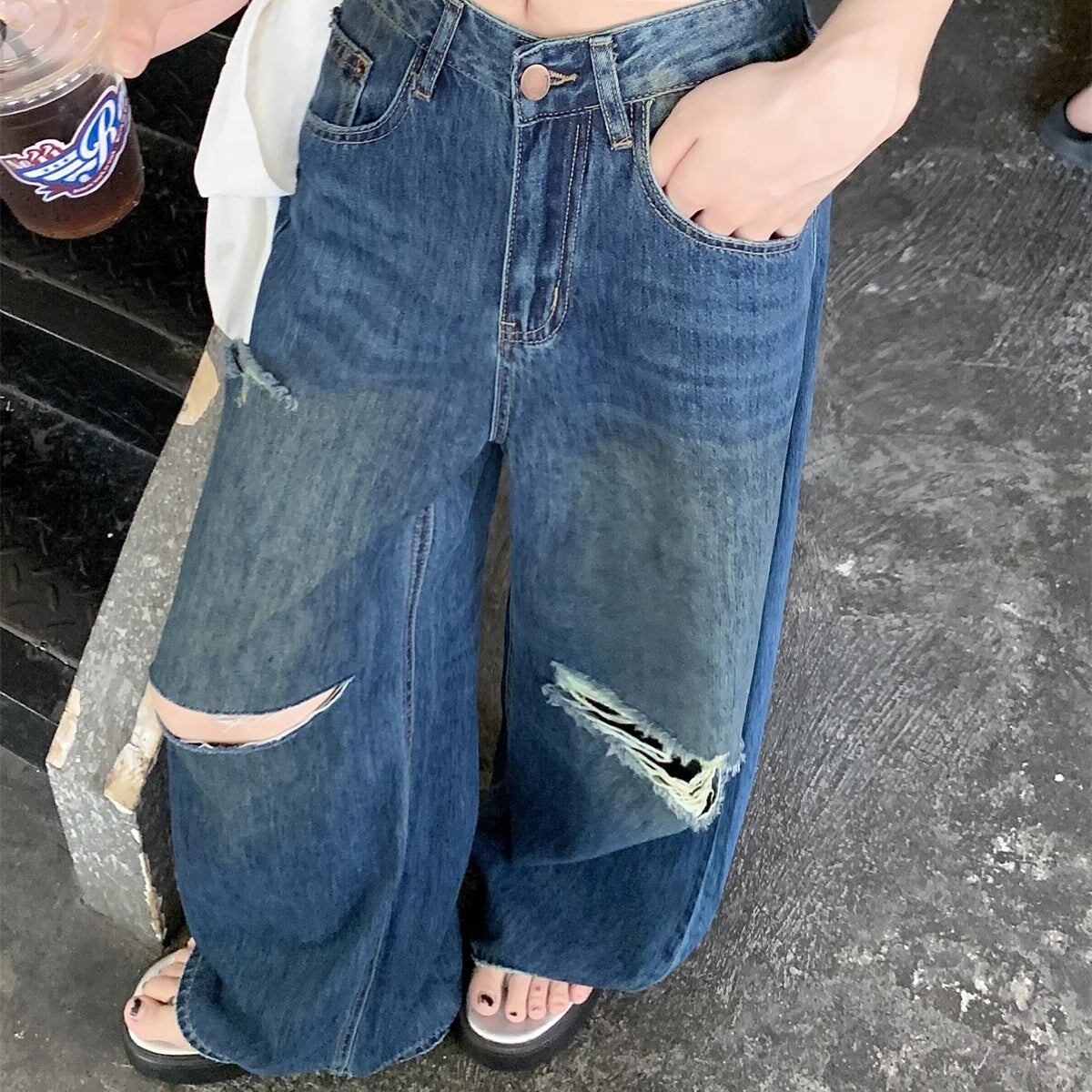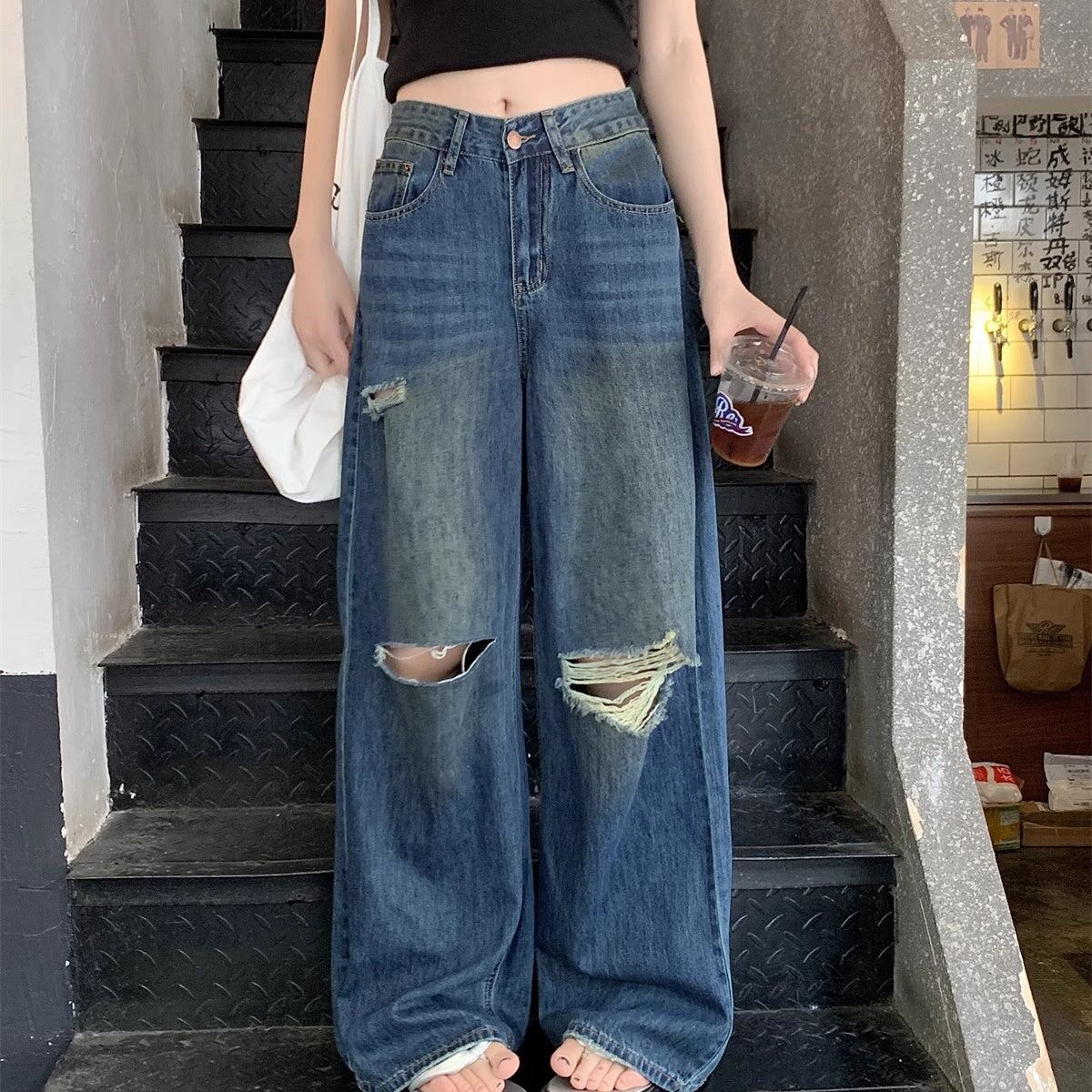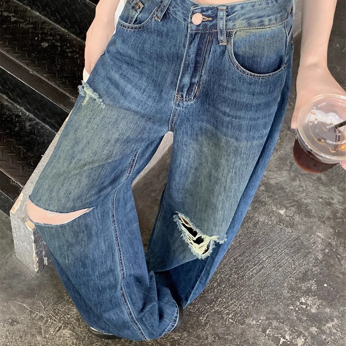 リップド ジーンズ レディース 韓国 ファッション ワイド デニムパンツ ダメージ加工 ヴィンテージデニム