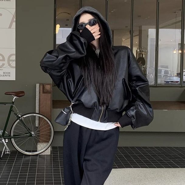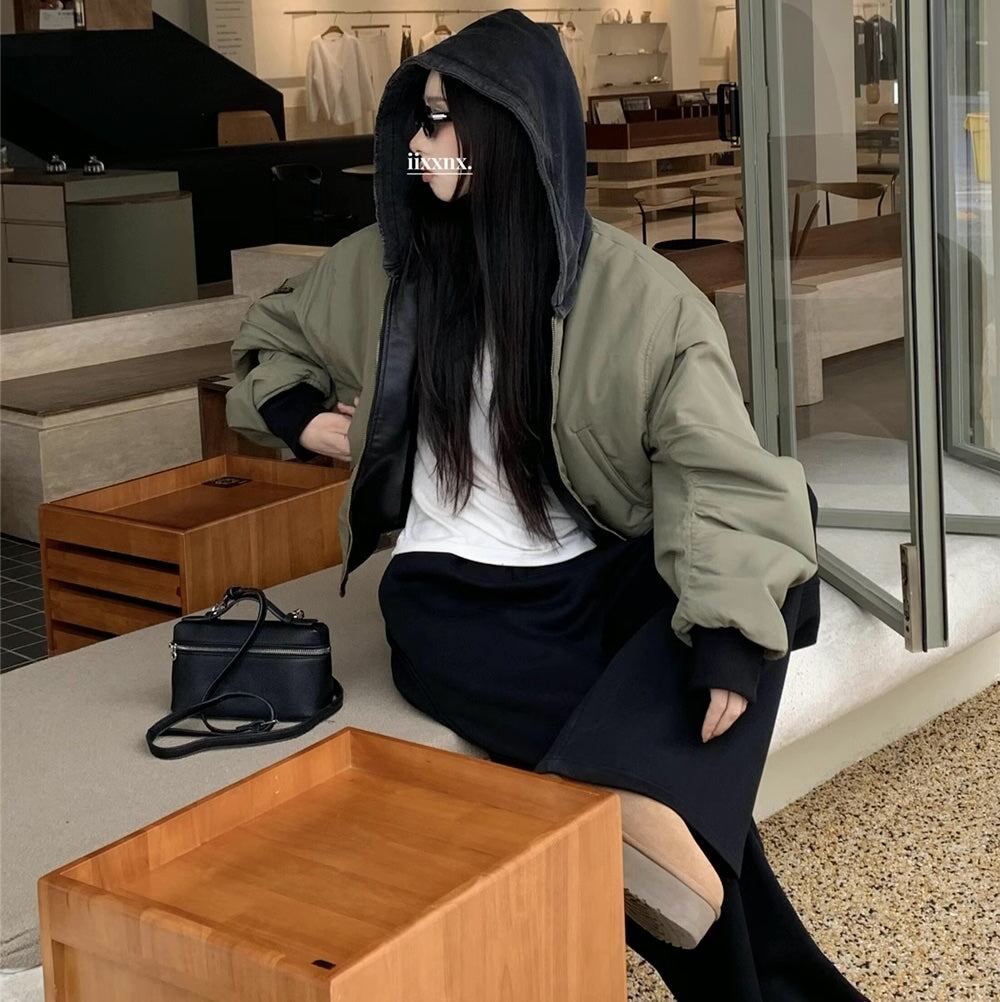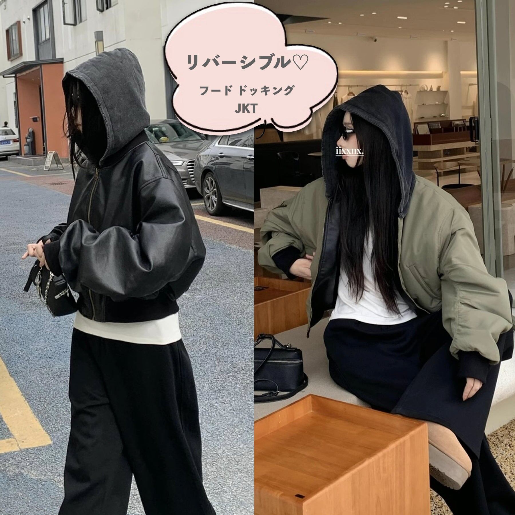 リバーシブル エコレザー ミリタリー ブルゾン レディース 中綿 フード ドッキング アウター 韓国 ファッション リバーシブル パーカージャケット クロップ丈 ジップアップ オーバーサイズ パテッドジャケット