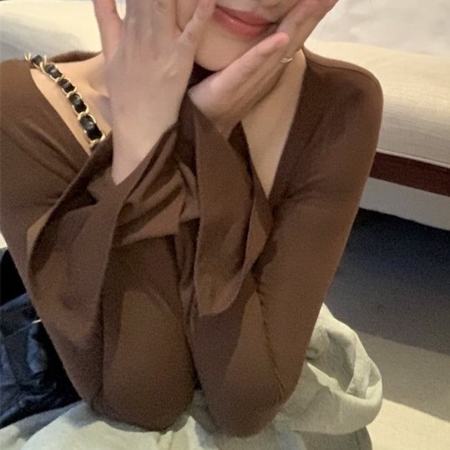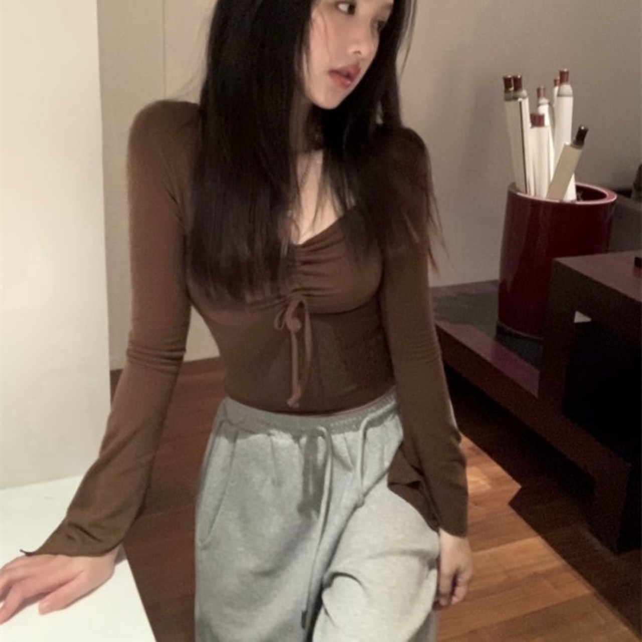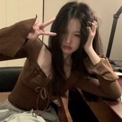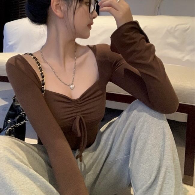 カットソー レディース 韓国 ファッション 着やせ タイトストレッチ リボン バスト デコルテ クロップトップ ショート丈 フレアスリーブ ベルスリーブ おしゃれ 春トップス スクエアネック