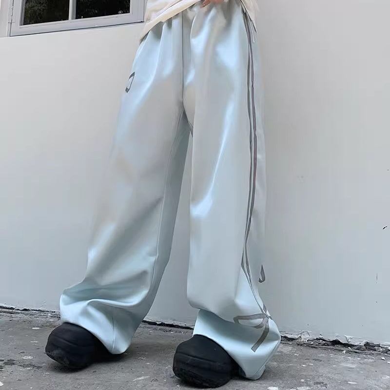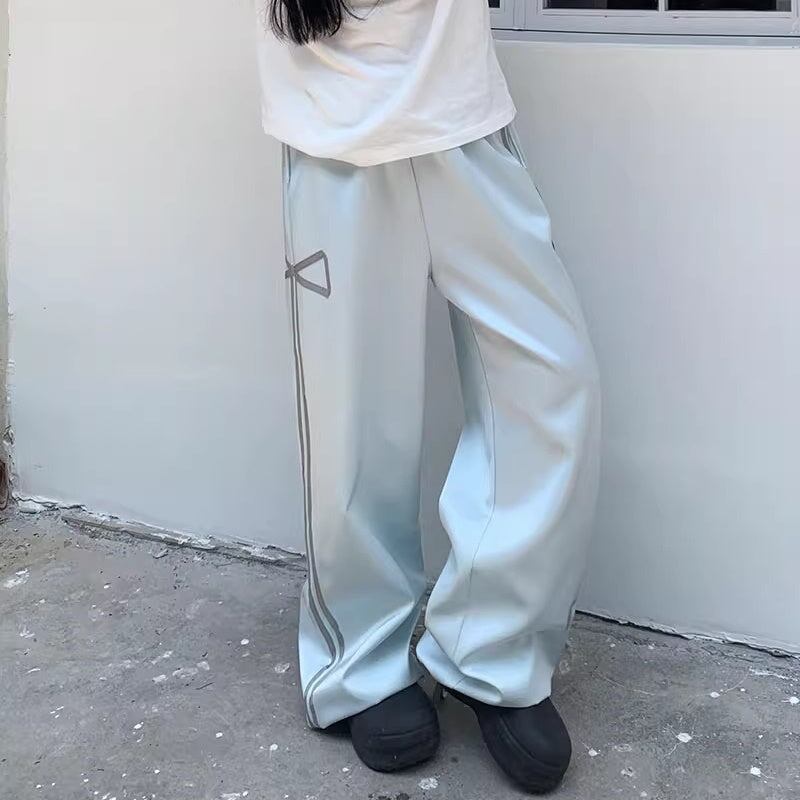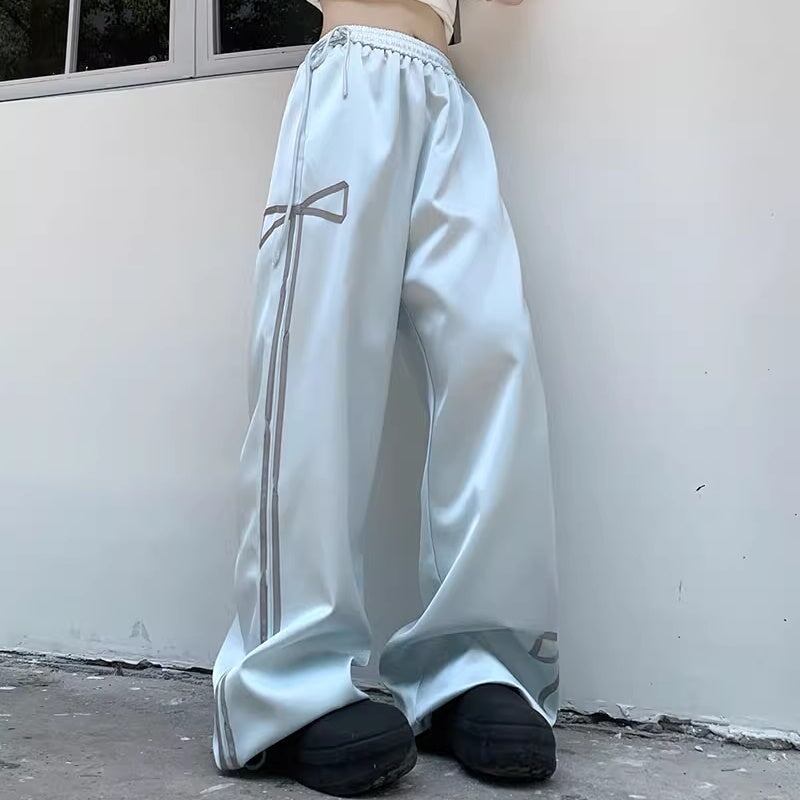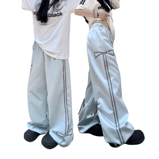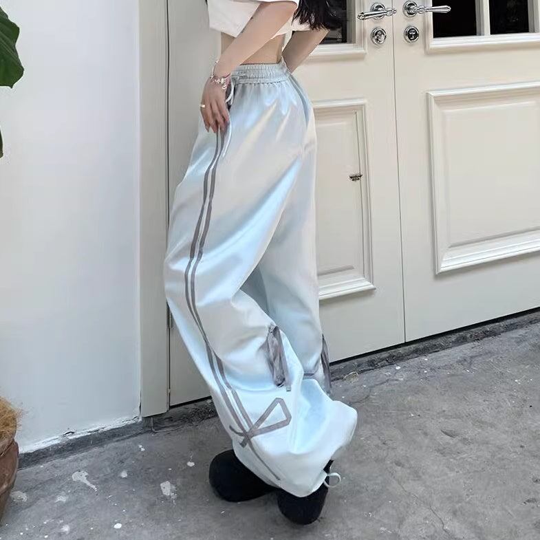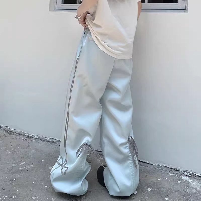 ラインジャージパンツ リボン バックシャン レディース 韓国 ファッション ガーリー ストリート 光沢 ライトブルー 太めパンツ モップパンツ