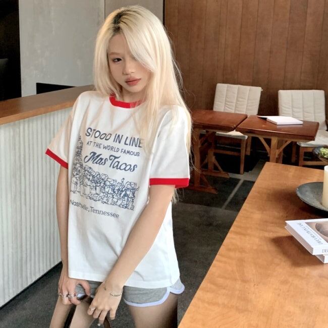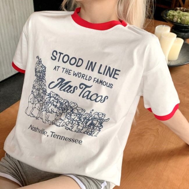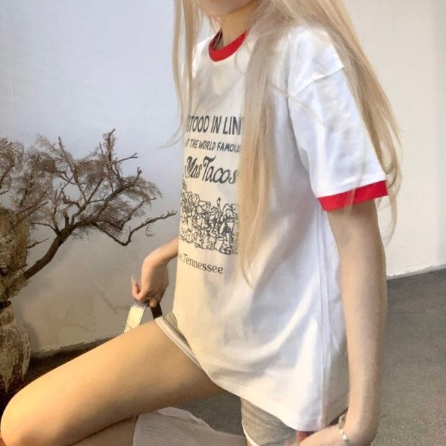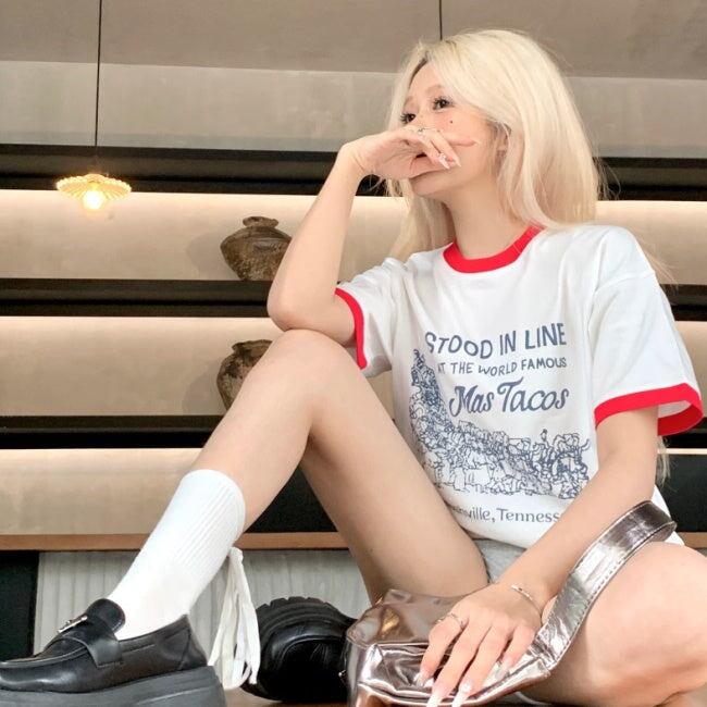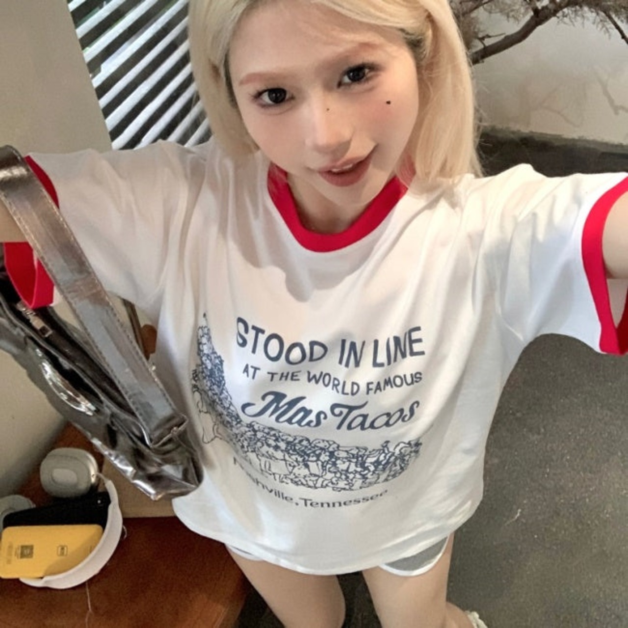 リンガー Tシャツ レディース 韓国 ファッション グラフィック tシャツ クルーネック バイカラー 半袖 メッセージT