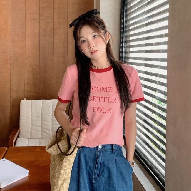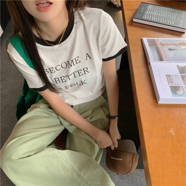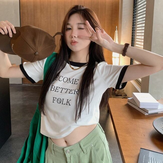 リンガー Tシャツ レディース 韓国 ファッション レター ロゴ プリント 夏トップス