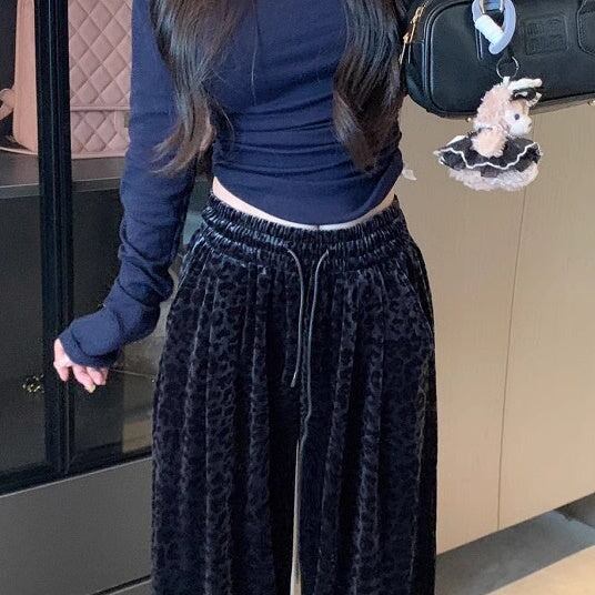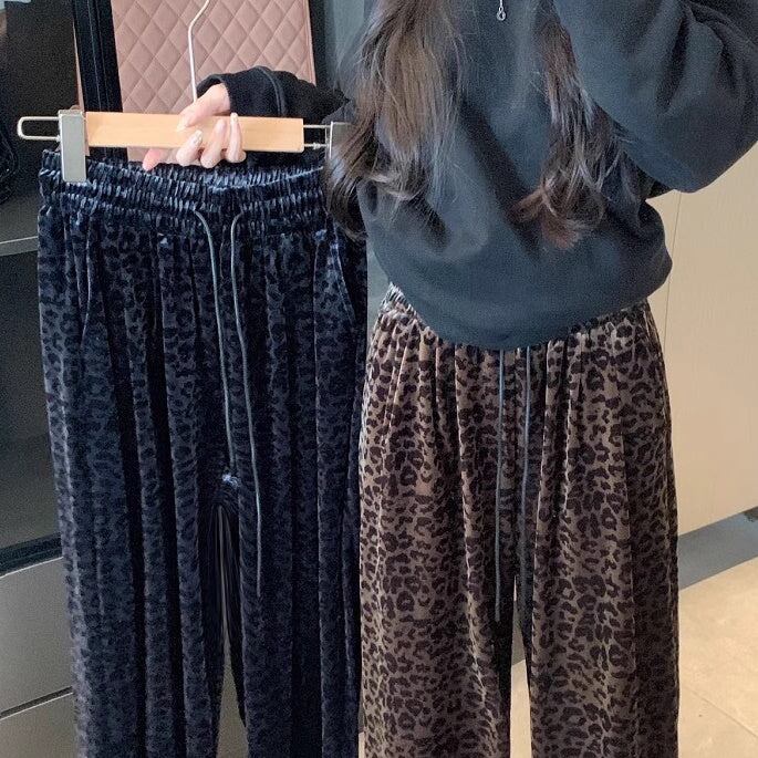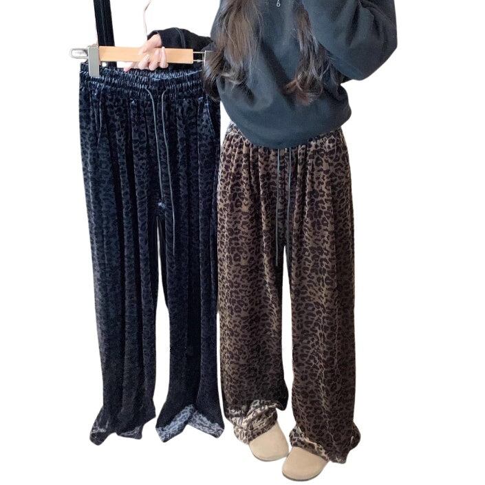 レオパード ワイドパンツ レディース 韓国 ファッション ベルベット ひょう柄 光沢 秋冬 パンツ