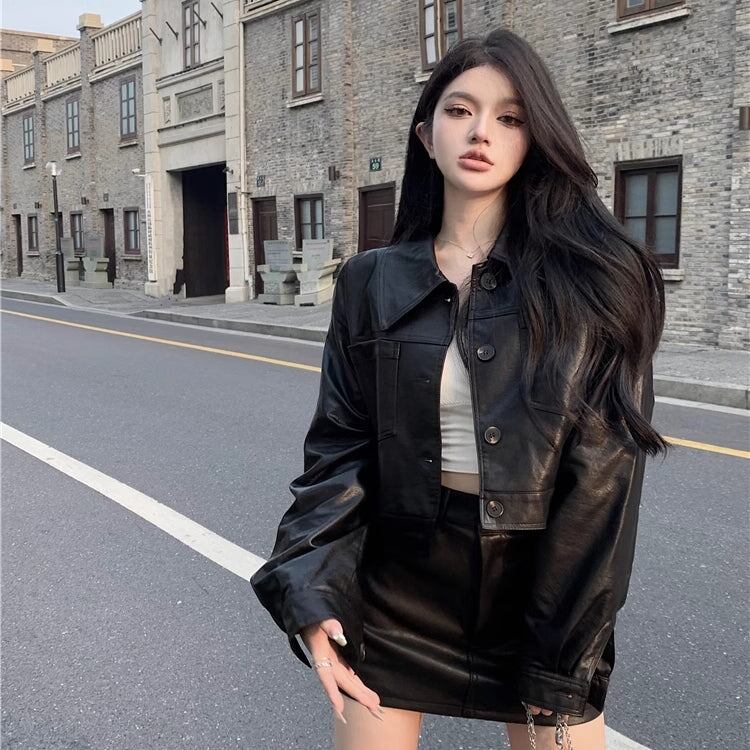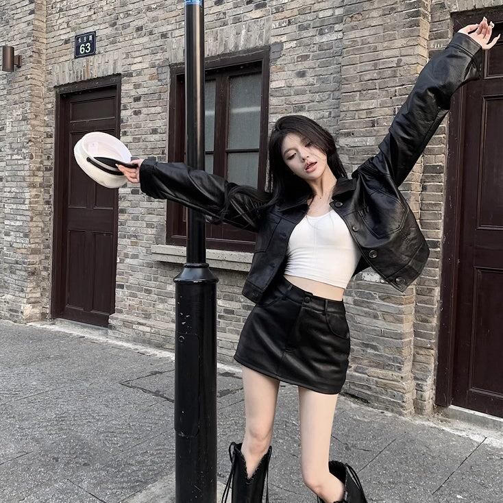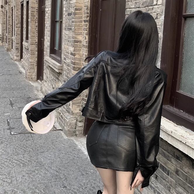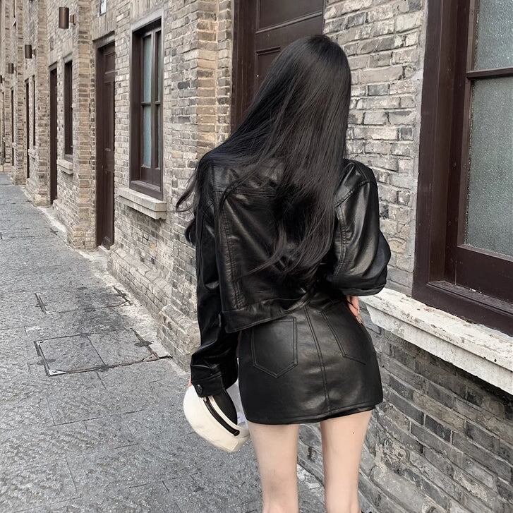 エコレザーのセットアップ ジャケットとミニスカート