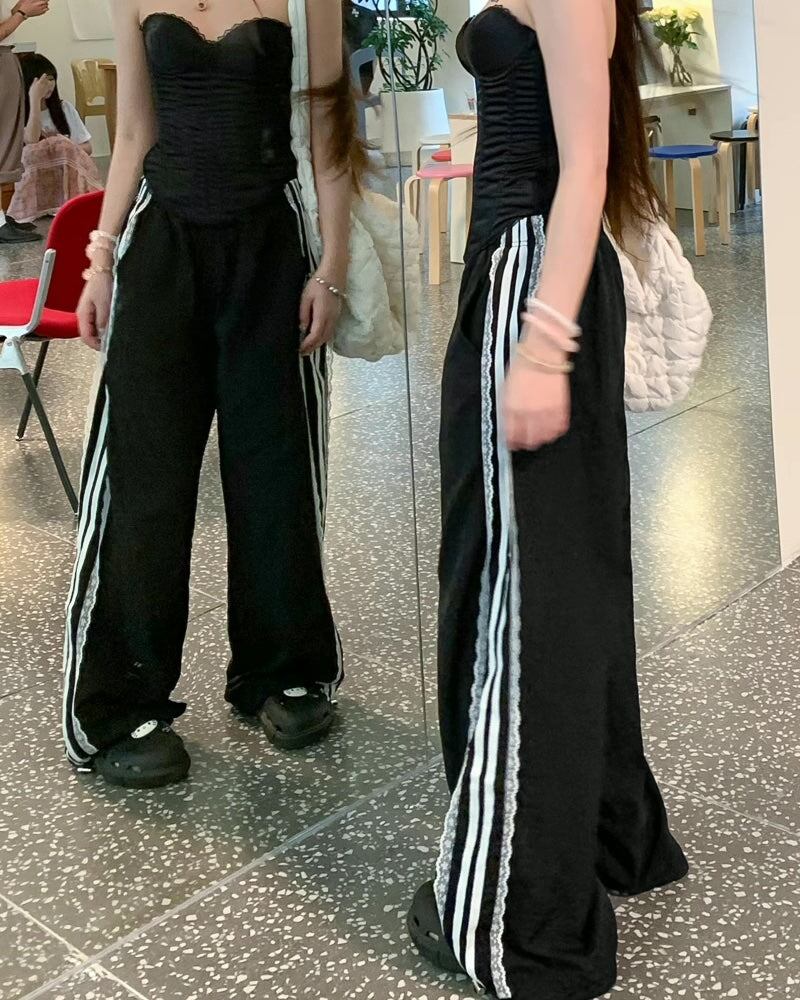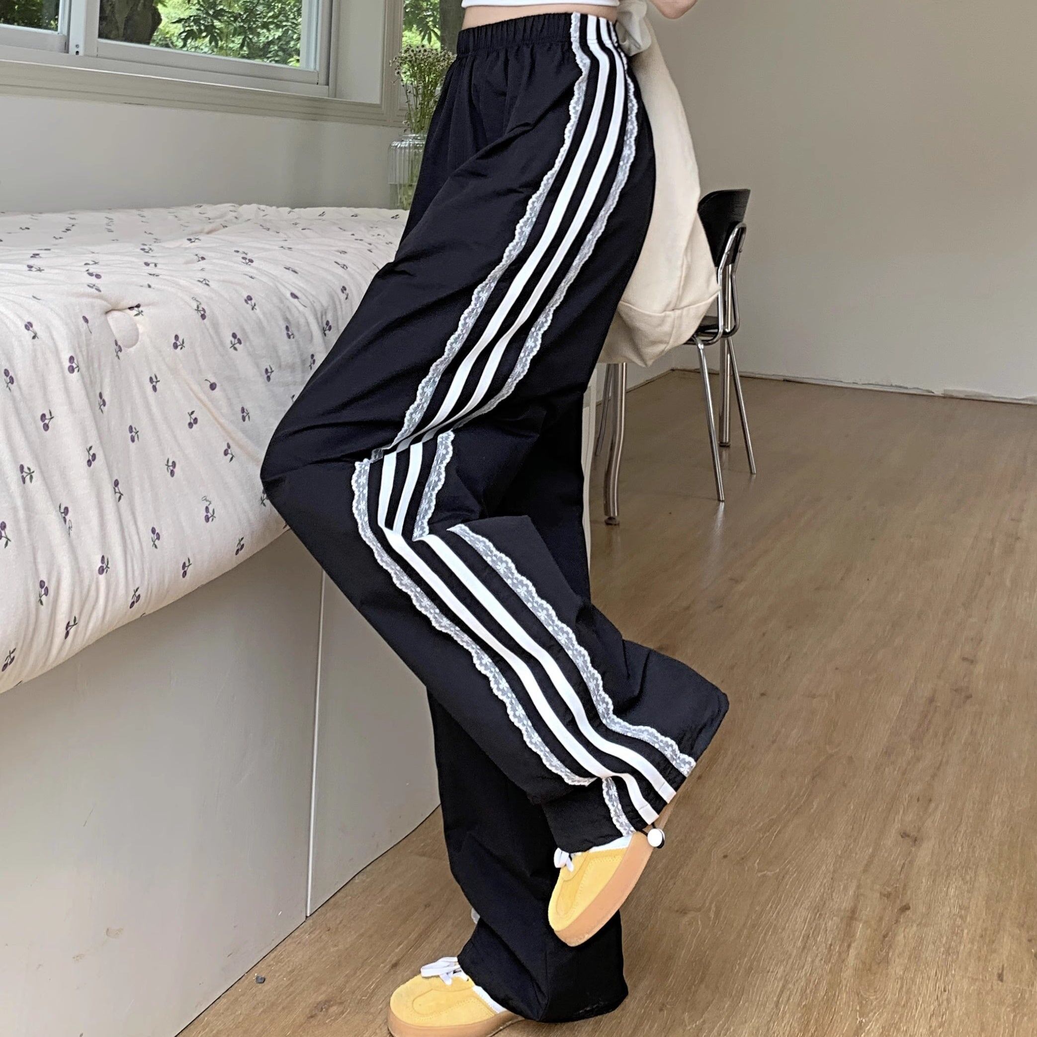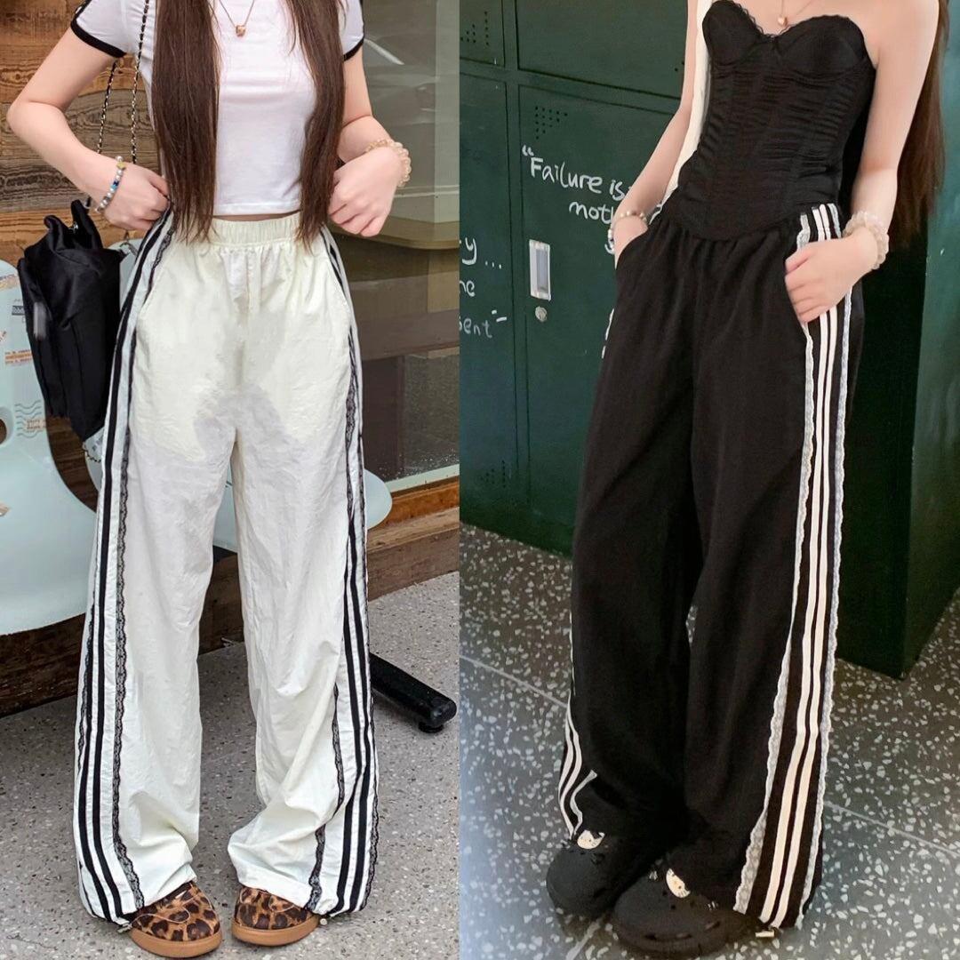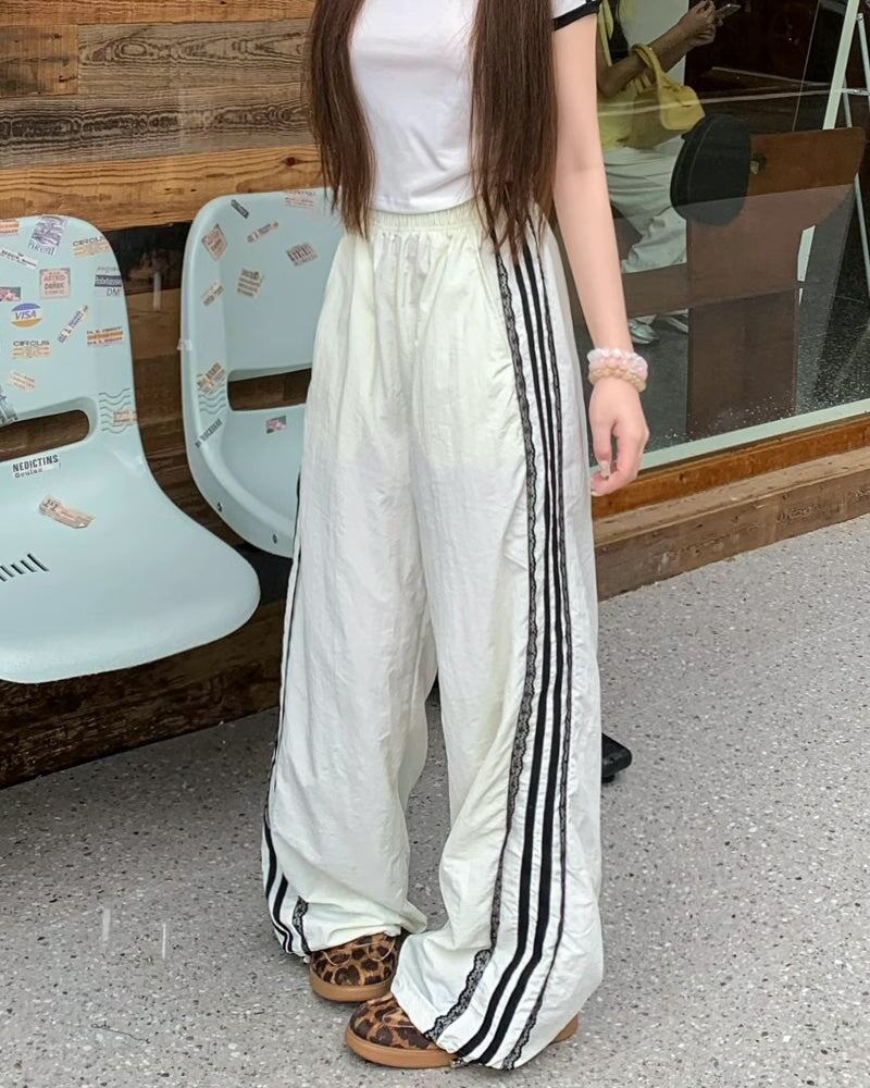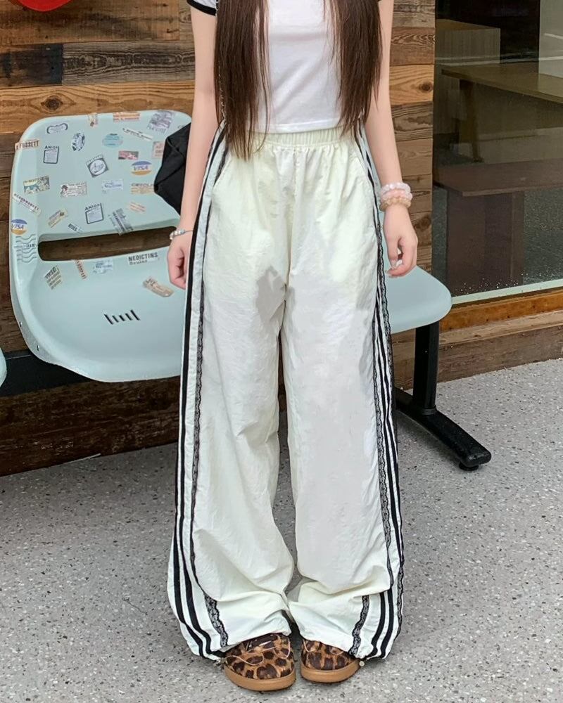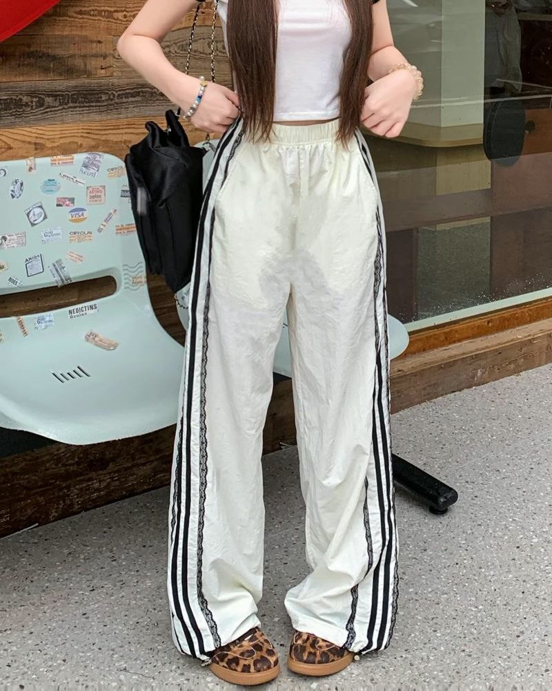 レース サイドライン ジャージ パンツ レディース 韓国 ファッション 裾絞り ドローコード ワイド パラシュートパンツ