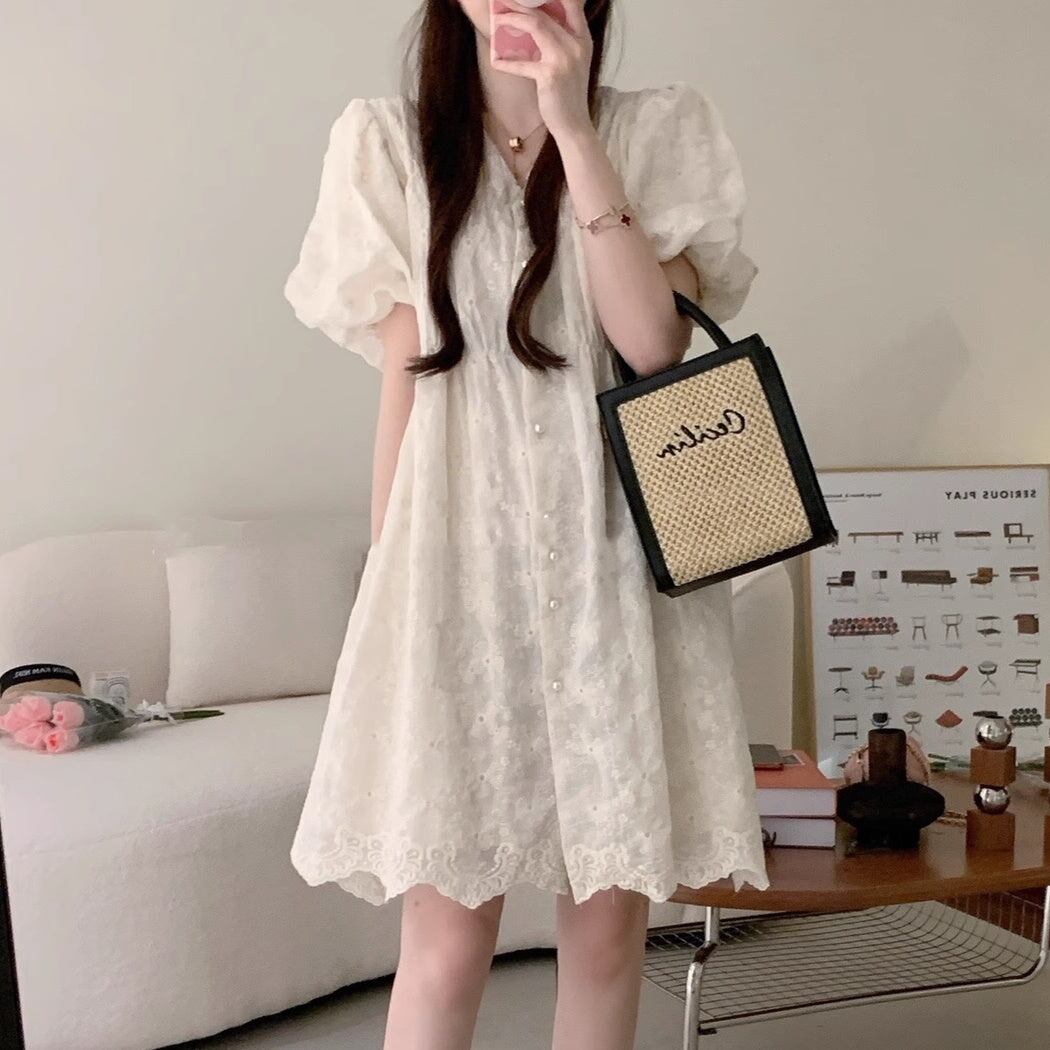 レース ボタン ワンピース 韓国 レディース 半袖 パフスリーブ 半袖 膝上丈 夏 ワンピ
