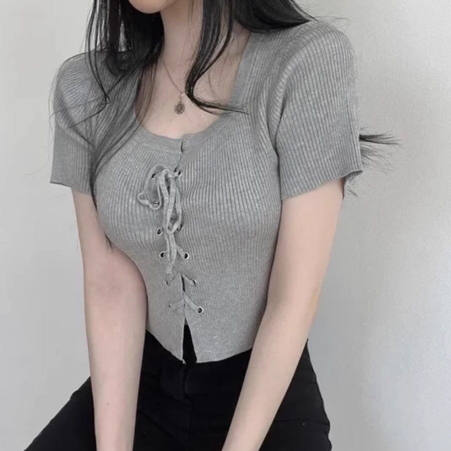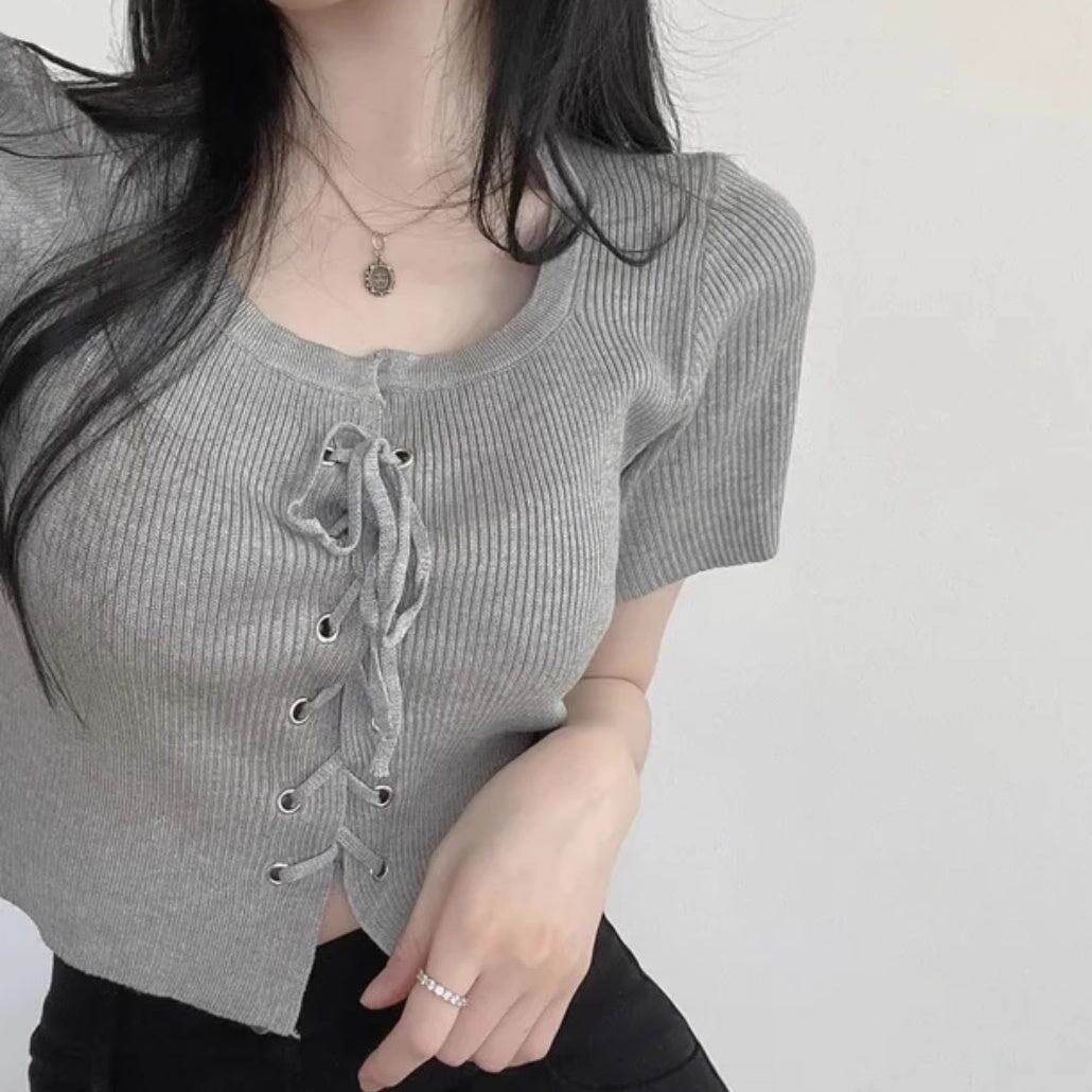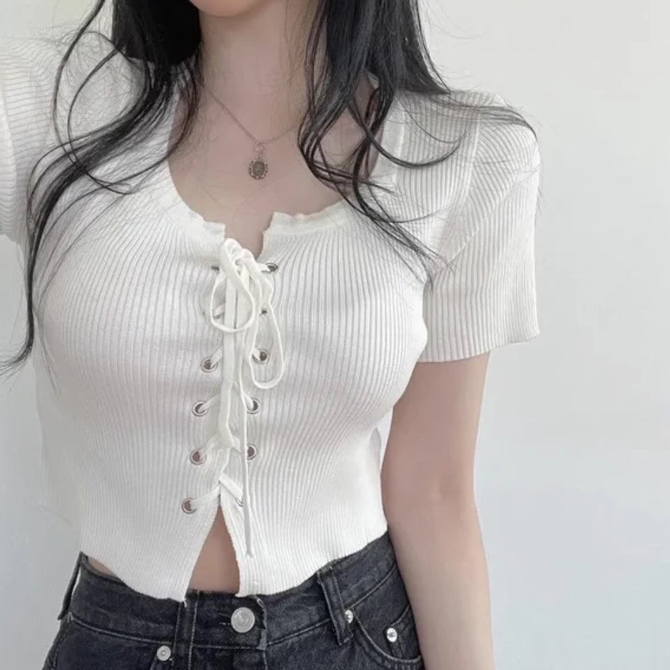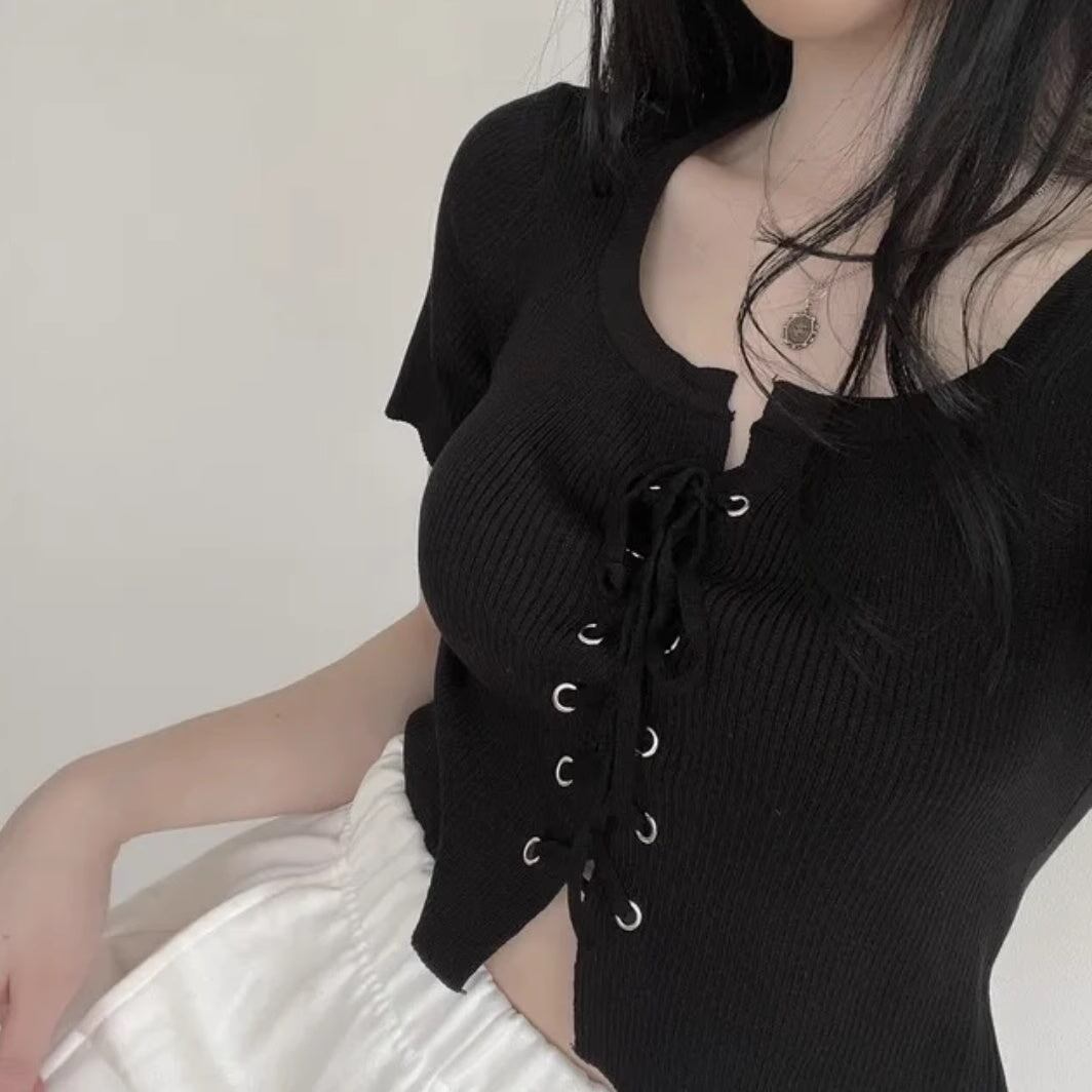 カットソー 半袖 レディース 韓国 ファッション レースアップ リボン セクシー かわいい クロップド トップス