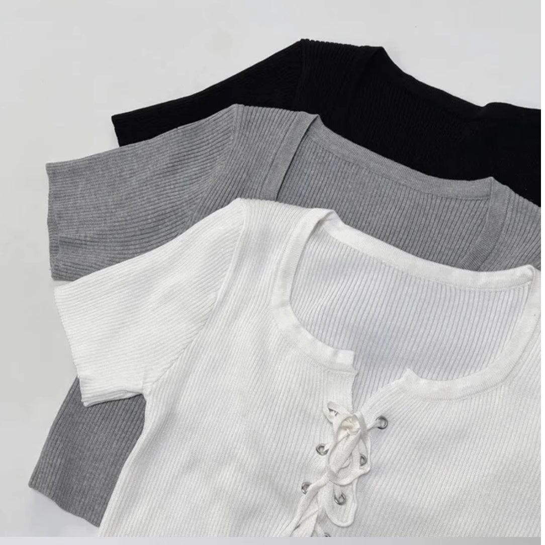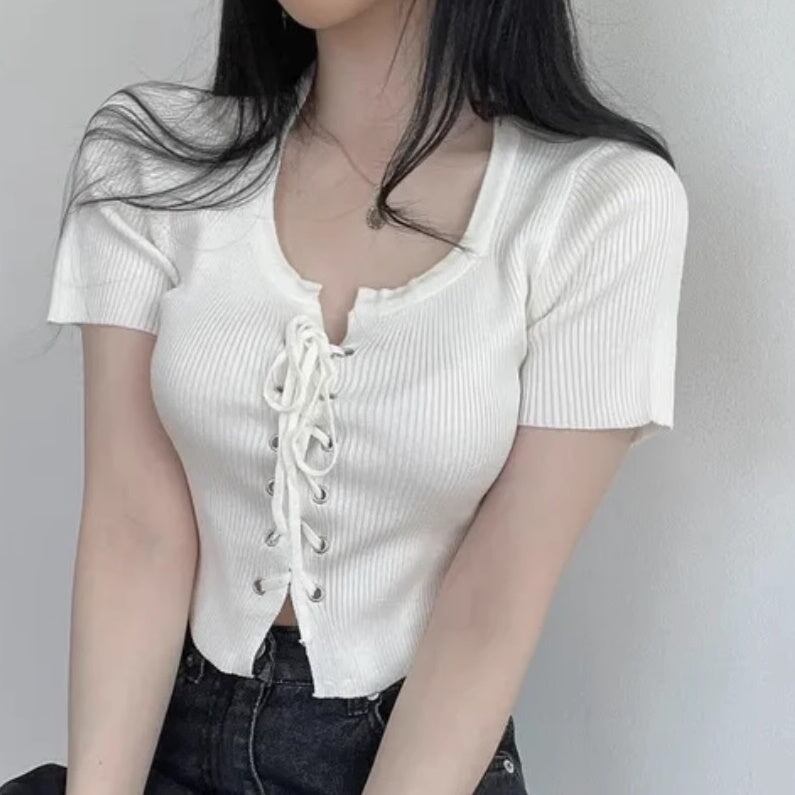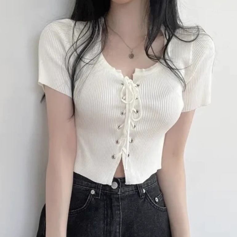 レースアップ 半袖 カットソー レディース 韓国 ファッション 夏 クロップド リブ素材 ストレッチ トップス