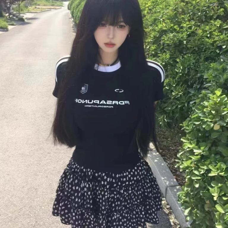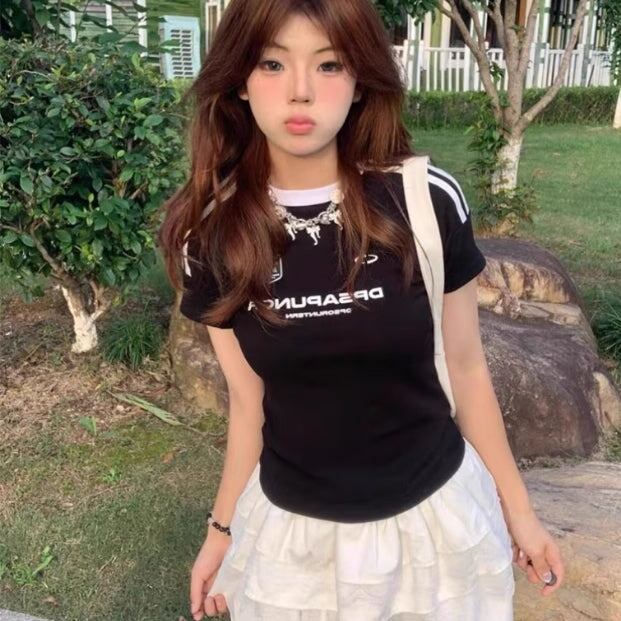 ロゴ Tシャツ レディース ライン リンガー タイトT 韓国 ファッション スポーティー チビT